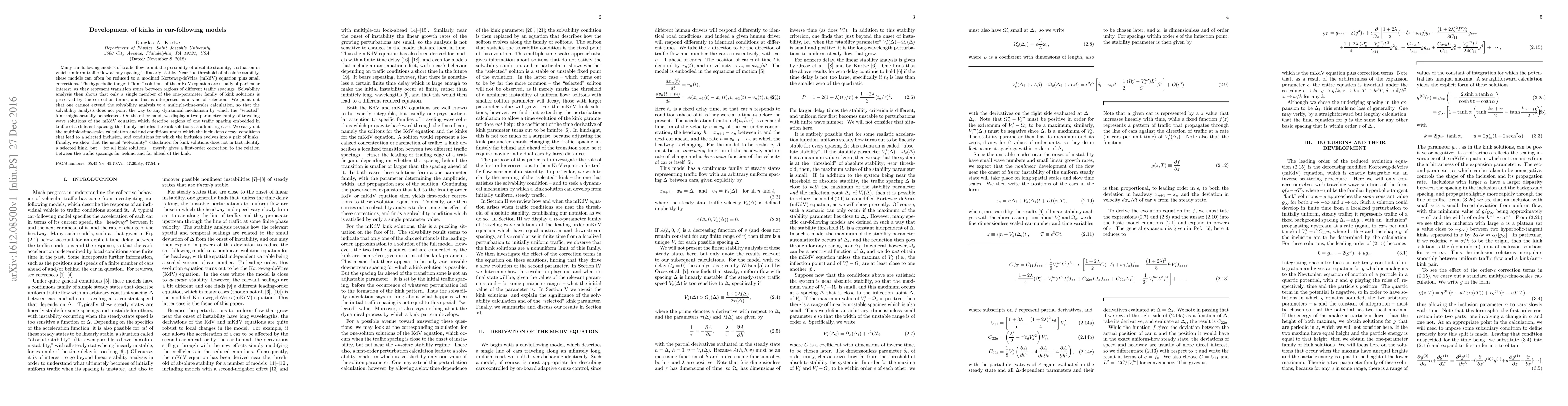 This paper explores the development of kinks in car-following models, showing that only one kink solution is preserved by small corrections near the threshold of absolute stability. It reveals that a two-parameter family of traveling wave solutions exists, including the kink solutions, and conducts a multiple-time-scales analysis to identify conditions for the decay or evolution of these solutions.