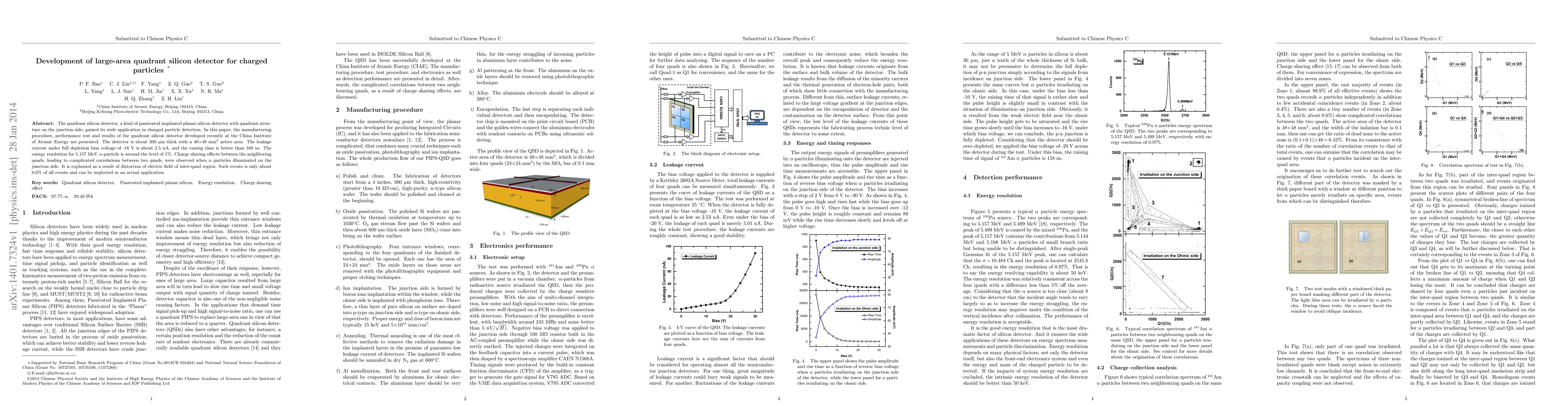 This paper details the development of a large-area quadrant silicon detector with a 48×48 mm² active area, showing a leakage current of 2.5 nA under -16 V bias, and an energy resolution of 1% for 5.157 MeV α-particles. Minor charge sharing effects, observed in 0.6% of events, are attributed to electric field distortion and deemed negligible for practical use.