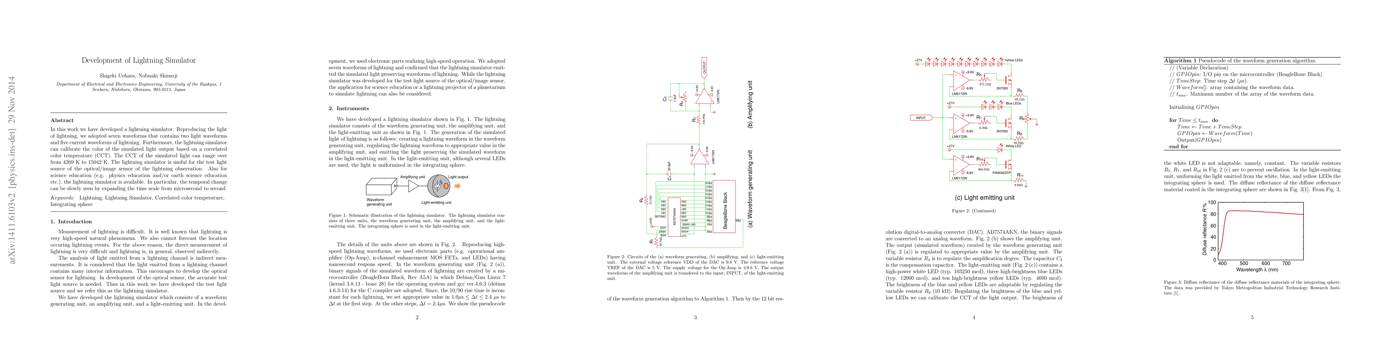 The paper details the development of a lightning simulator that reproduces lightning's light and current waveforms, with adjustable color temperature ranging from 4269 K to 15042 K, useful for testing optical sensors and educational purposes in physics and earth science. The simulator can also display temporal changes over a wide time scale from microseconds to seconds.