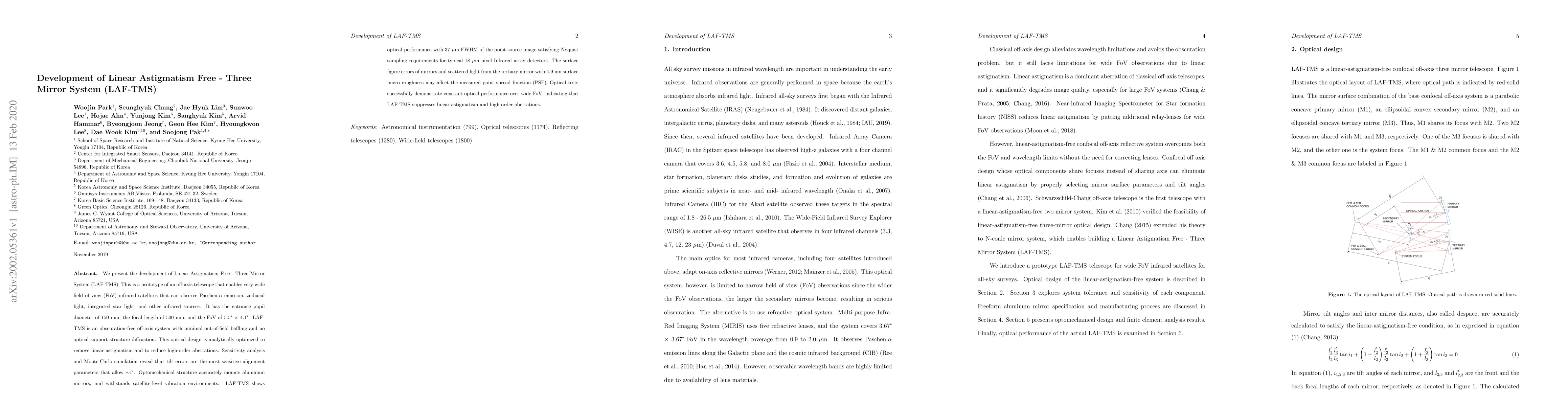 We present the development of Linear Astigmatism Free - Three Mirror System (LAF-TMS). This is a prototype of an off-axis telescope that enables very wide field of view (FoV) infrared satellites that can observe Paschen-$\alpha$ emission, zodiacal light, integrated star light, and other infrared sources. It has the entrance pupil diameter of 150 mm, the focal length of 500 mm, and the FoV of 5.5$^\circ$ $\times$ 4.1$^\circ$. LAF-TMS is an obscuration-free off-axis system with minimal out-of-field baffling and no optical support structure diffraction. This optical design is analytically optimized to remove linear astigmatism and to reduce high-order aberrations. Sensitivity analysis and Monte-Carlo simulation reveal that tilt errors are the most sensitive alignment parameters that allow $\sim$1$^\prime$. Optomechanical structure accurately mounts aluminum mirrors, and withstands satellite-level vibration environments. LAF-TMS shows optical performance with 37 $\mu$m FWHM of the point source image satisfying Nyquist sampling requirements for typical 18 $\mu$m pixel Infrared array detectors. The surface figure errors of mirrors and scattered light from the tertiary mirror with 4.9 nm surface micro roughness may affect the measured point spread function (PSF). Optical tests successfully demonstrate constant optical performance over wide FoV, indicating that LAF-TMS suppresses linear astigmatism and high-order aberrations.