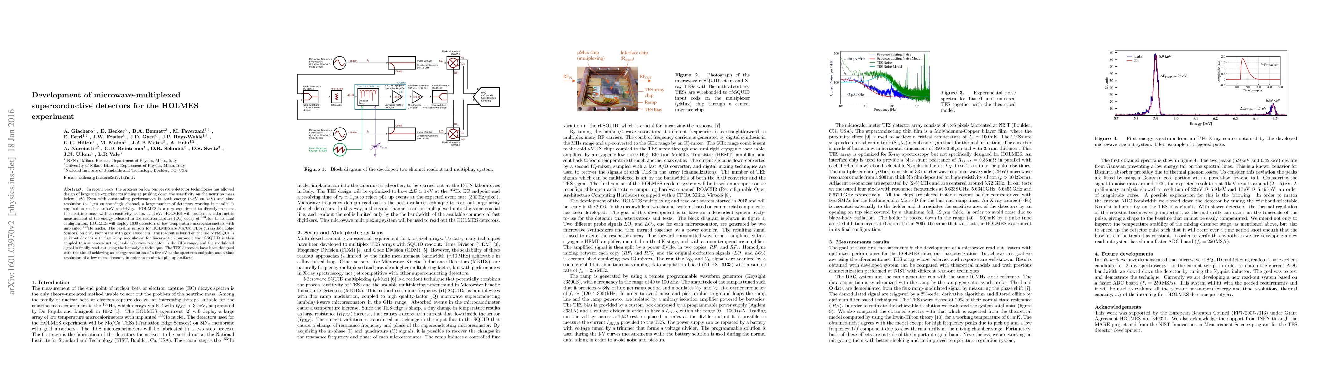 This paper details the development of microwave-multiplexed superconductive detectors for the HOLMES experiment, which aims to measure neutrino mass with a sensitivity of 2 eV. The detectors utilize Mo/Cu Transition Edge Sensors coupled with GHz-range rf-SQUIDs and superconducting resonators, achieving high energy and time resolution to minimize pile-up artifacts.