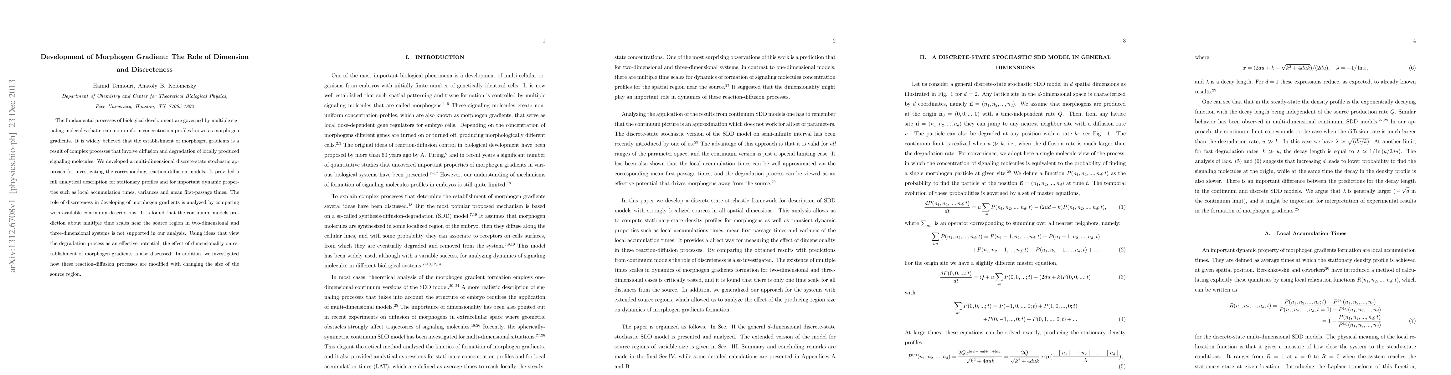 The fundamental processes of biological development are governed by multiple signaling molecules that create non-uniform concentration profiles known as morphogen gradients. It is widely believed that the establishment of morphogen gradients is a result of complex processes that involve diffusion and degradation of locally produced signaling molecules. We developed a multi-dimensional discrete-state stochastic approach for investigating the corresponding reaction-diffusion models. It provided a full analytical description for stationary profiles and for important dynamic properties such as local accumulation times, variances and mean first-passage times. The role of discreteness in developing of morphogen gradients is analyzed by comparing with available continuum descriptions. It is found that the continuum models prediction about multiple time scales near the source region in two-dimensional and three-dimensional systems is not supported in our analysis. Using ideas that view the degradation process as an effective potential, the effect of dimensionality on establishment of morphogen gradients is also discussed. In addition, we investigated how these reaction-diffusion processes are modified with changing the size of the source region.