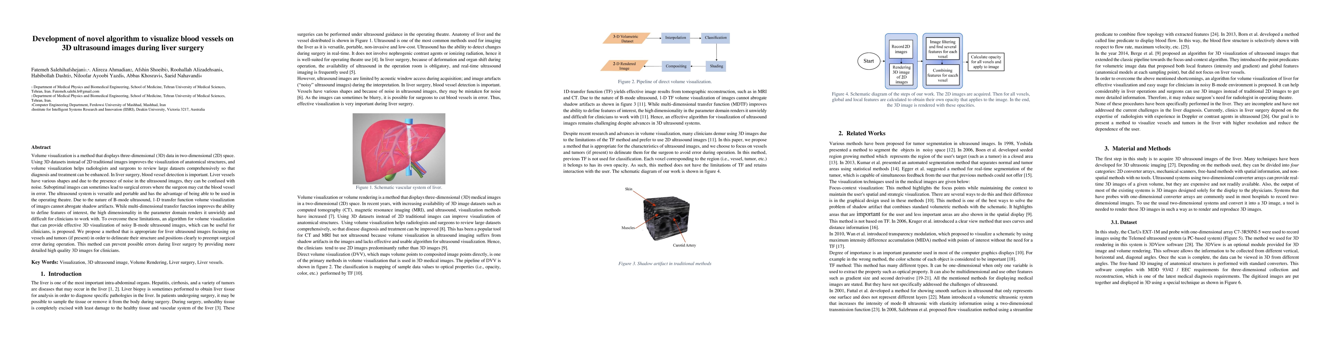 Volume visualization is a method that displays three-dimensional (3D) data in two-dimensional (2D) space. Using 3D datasets instead of 2D traditional images improves the visualization of anatomical structures, and volume visualization helps radiologists and surgeons to review large datasets comprehensively so that diagnosis and treatment can be enhanced. In liver surgery, blood vessel detection is important. Liver vessels have various shapes and due to the presence of noise in the ultrasound images, they can be confused with noise. Suboptimal images can sometimes lead to surgical errors where the surgeon may cut the blood vessel in error. The ultrasound system is versatile and portable and has the advantage of being able to be used in the operating theatre. Due to the nature of B-mode ultrasound, 1-D transfer function volume visualization of images cannot abrogate shadow artifacts. While multi-dimensional transfer function improves the ability to define features of interest, the high dimensionality in the parameter domain renders it unwieldy and difficult for clinicians to work with. To overcome these limitations, an algorithm for volume visualization that can provide effective 3D visualization of noisy B-mode ultrasound images, which can be useful for clinicians, is proposed. We propose a method that is appropriate for liver ultrasound images focusing on vessels and tumors (if present) in order to delineate their structure and positions clearly to preempt surgical error during operation. This method can prevent possible errors during liver surgery by providing more detailed high quality 3D images for clinicians. Key Words: Visualization, 3D ultrasound image, Volume Rendering, Liver surgery, Liver vessels.