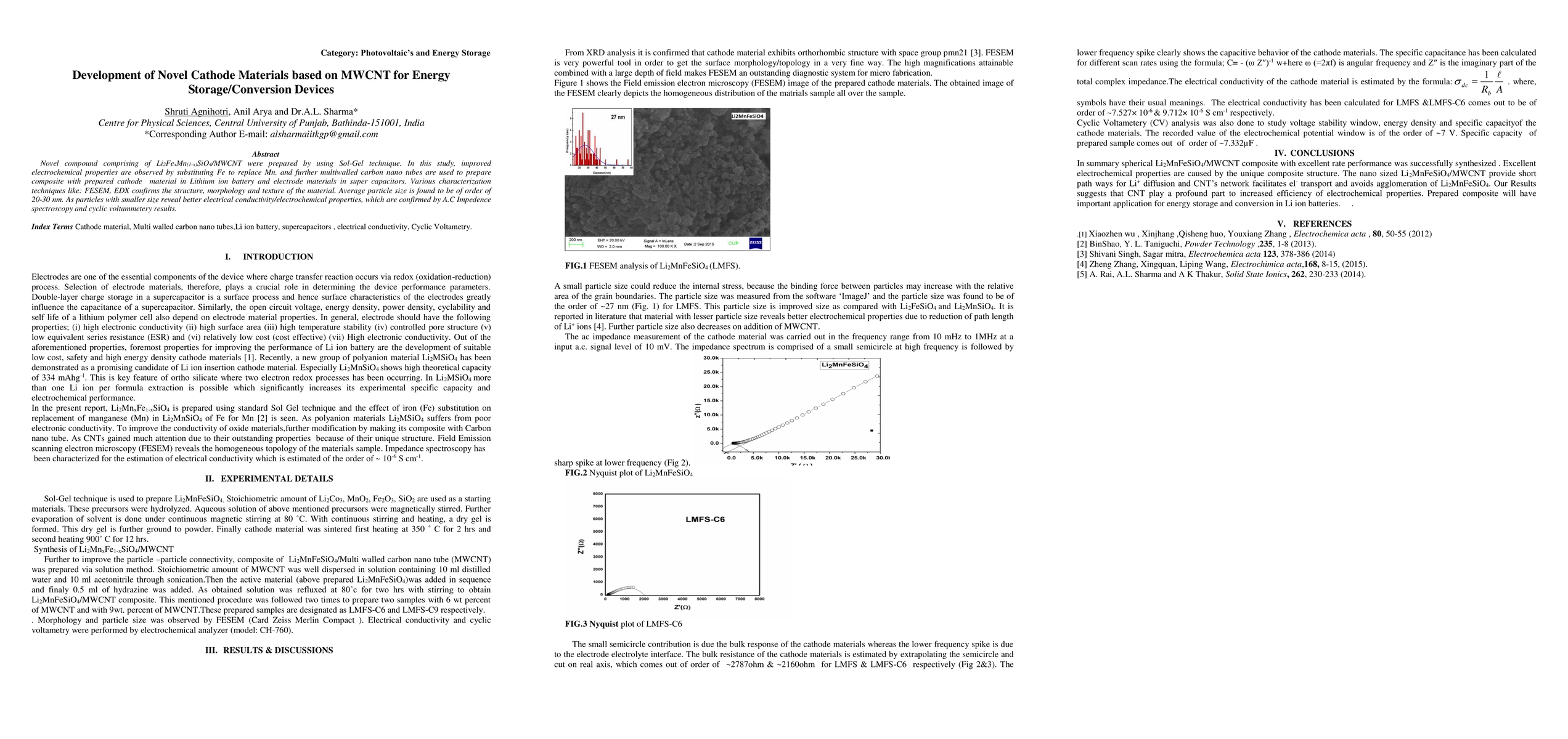 Novel compound comprising of Li2FexMn(1-x)SiO4/MWCNT were prepared by using Sol-Gel technique. In this study, improved electrochemical properties are observed by substituting Fe to replace Mn. and further multiwalled carbon nano tubes are used to prepare composite with prepared cathode material in Lithium ion battery and electrode materials in super capacitors. Various characterization techniques like: FESEM, EDX confirms the structure, morphology and texture of the material. Average particle size is found to be of order of 20-30 nm. As particles with smaller size reveal better electrical conductivity/electrochemical properties, which are confirmed by A.C Impedence spectroscopy and cyclic voltammetery results.