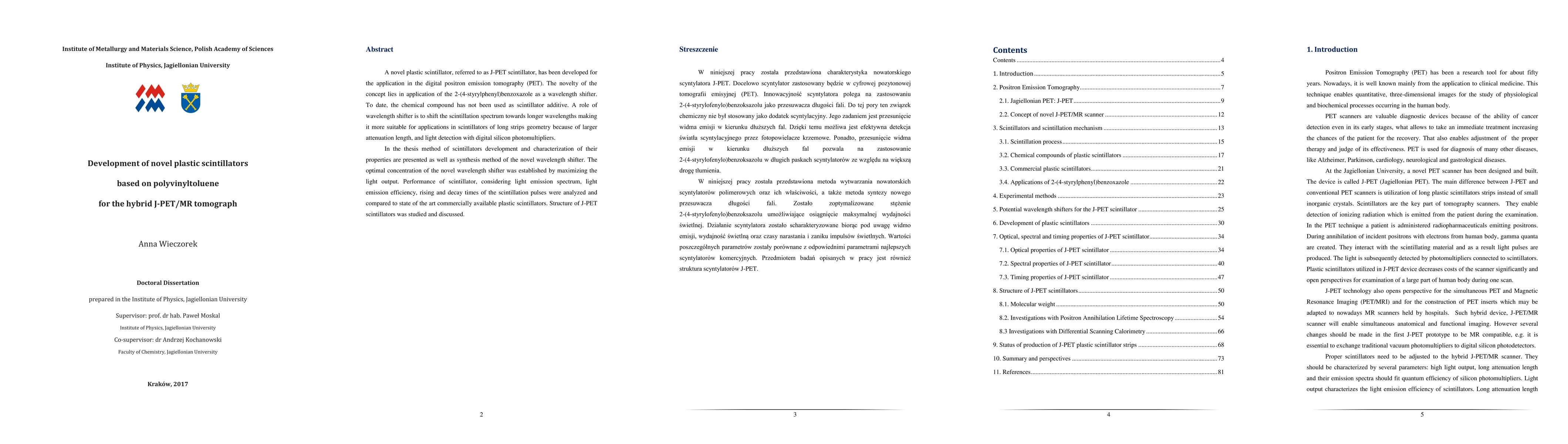 A novel plastic scintillator, referred to as J-PET scintillator, has been developed for the application in the digital positron emission tomography (PET). The novelty of the concept lies in application of the 2-(4-styrylphenyl)benzoxazole as a wavelength shifter. To date, the chemical compound has not been used as scintillator additive. A role of wavelength shifter is to shift the scintillation spectrum towards longer wavelengths making it more suitable for applications in scintillators of long strips geometry because of larger attenuation length, and light detection with digital silicon photomultipliers. In the thesis method of scintillators development and characterization of their properties are presented as well as synthesis method of the novel wavelength shifter. The optimal concentration of the novel wavelength shifter was established by maximizing the light output. Performance of scintillator, considering light emission spectrum, light emission efficiency, rising and decay times of the scintillation pulses were analyzed and compared to state of the art commercially available plastic scintillators. Structure of J-PET scintillators was studied and discussed.