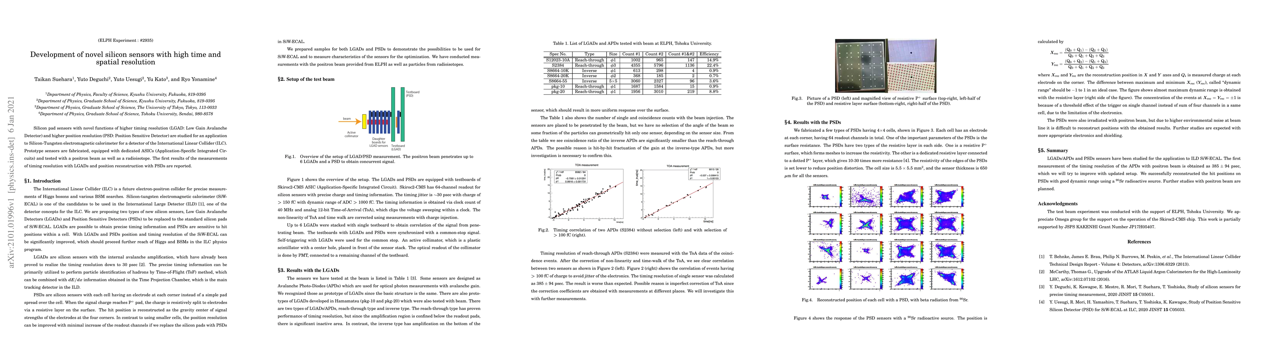 The paper presents the development of new silicon sensors, LGADs for superior timing resolution and PSDs for higher position resolution, for use in a Silicon-Tungsten electromagnetic calorimeter for the ILC. Testing with positron beams and radioisotopes yielded promising results, with initial measurements of enhanced timing resolution from LGADs and effective position reconstruction by PSDs reported.
