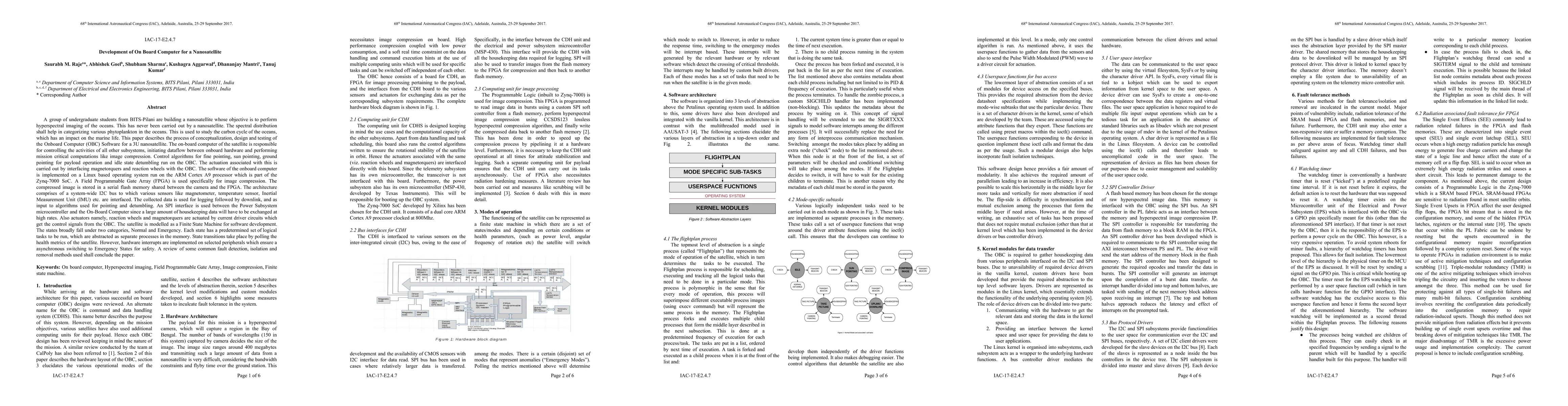 This paper details the design and testing of an onboard computer (OBC) for a 3U nanosatellite, featuring software for dataflow management, image compression, and control algorithms, implemented on a Linux-based ARM Cortex A9 processor with FPGA support. The system includes a Finite State Machine for state transitions and fault detection mechanisms.