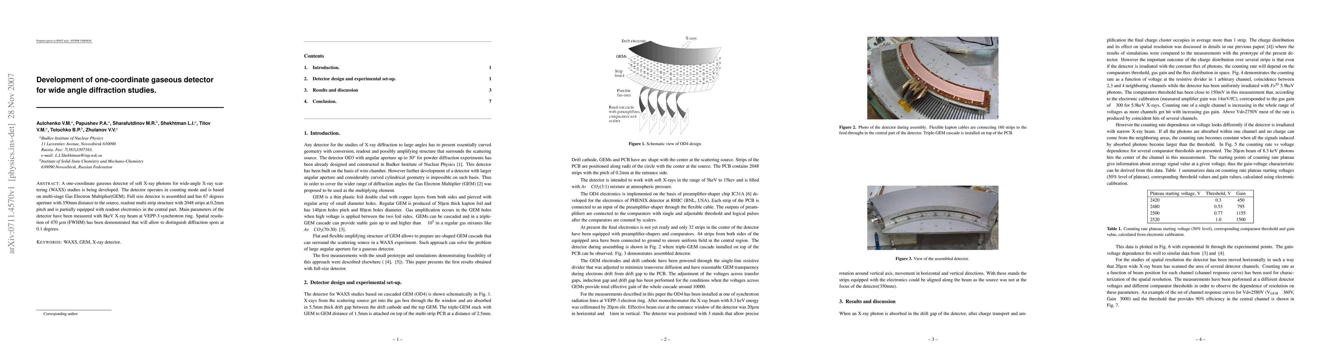 A one-coordinate gaseous detector of soft X-ray photons for wide-angle X-ray scattering (WAXS) studies is being developed. The detector operates in counting mode and is based on multi-stage Gas Electron Multiplier(GEM). Full size detector is assembled and has 67 degrees aperture with 350mm distance to the source, readout multi-strip structure with 2048 strips at 0.2mm pitch and is partially equipped with readout electronics in the central part. Main parameters of the detector have been measured with 8keV X-ray beam at VEPP-3 synchrotron ring. Spatial resolution of 470 um (FWHM) has been demonstrated that will allow to distinguish diffraction spots at 0.1 degrees.