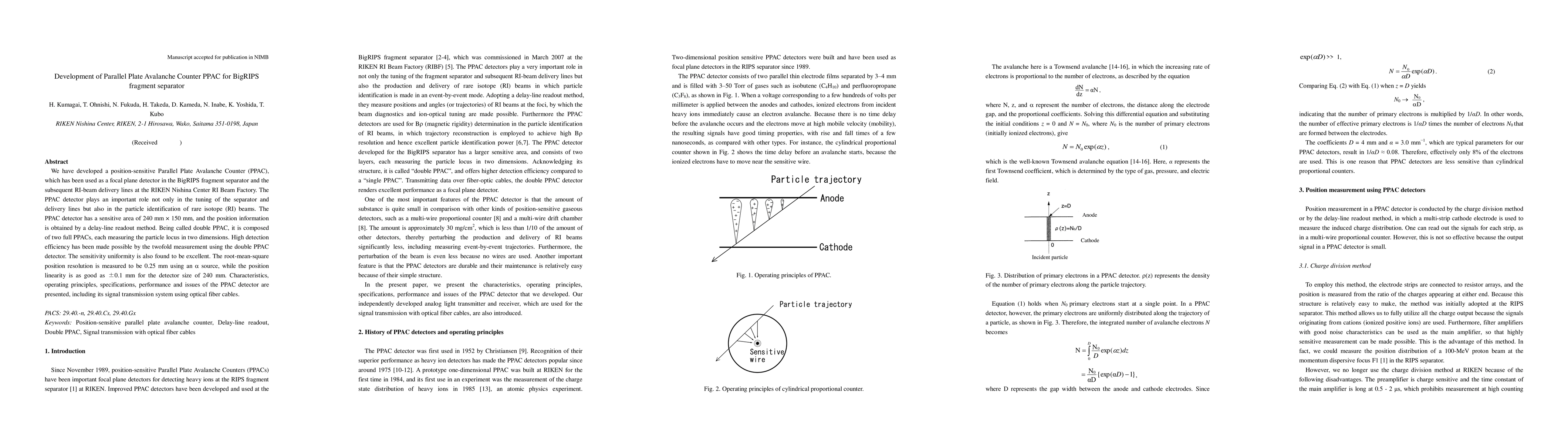 The research paper details the development of a position-sensitive Parallel Plate Avalanche Counter (PPAC) used as a focal plane detector in the BigRIPS fragment separator. The double PPAC detector, with a sensitive area of 240 mm x 150 mm, provides high detection efficiency and excellent position resolution of 0.25 mm, aiding in the tuning and particle identification of rare isotope beams.