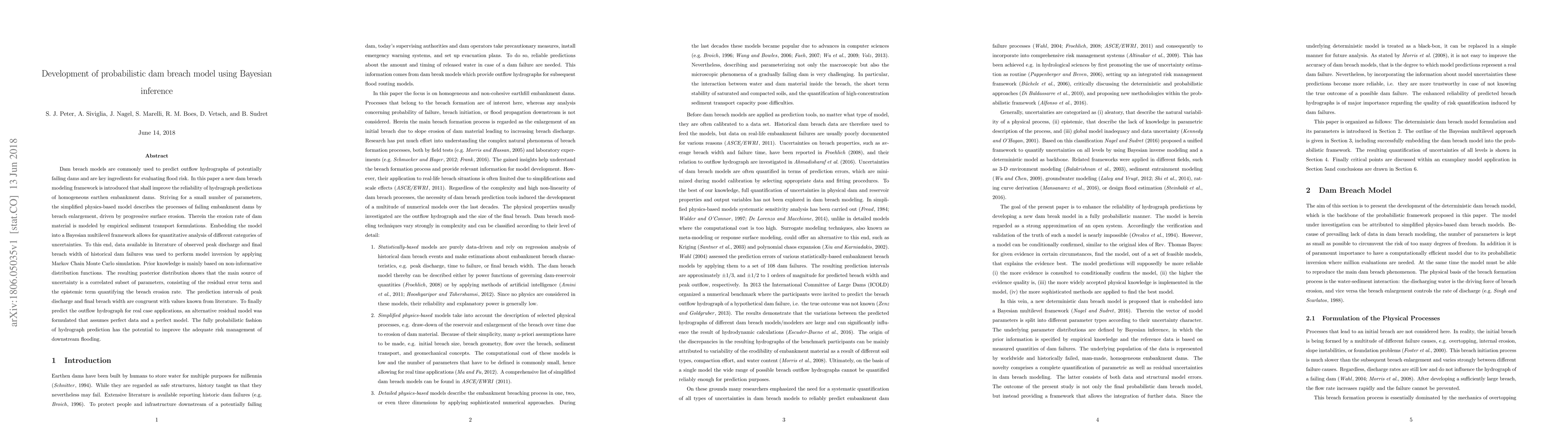 This paper introduces a probabilistic dam breach model using Bayesian inference to improve the reliability of hydrograph predictions for earthen embankment dams. The model, embedded in a Bayesian framework, analyzes uncertainties and uses historical data to refine predictions, highlighting correlated parameter uncertainties and offering improved risk management for downstream flooding.
