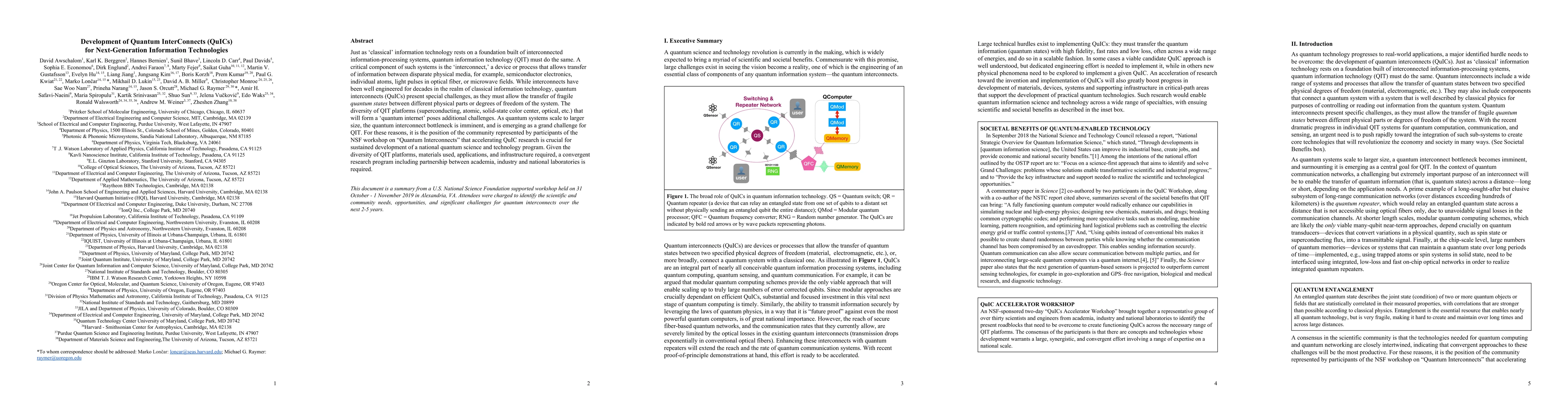 Just as classical information technology rests on a foundation built of interconnected information-processing systems, quantum information technology (QIT) must do the same. A critical component of such systems is the interconnect, a device or process that allows transfer of information between disparate physical media, for example, semiconductor electronics, individual atoms, light pulses in optical fiber, or microwave fields. While interconnects have been well engineered for decades in the realm of classical information technology, quantum interconnects (QuICs) present special challenges, as they must allow the transfer of fragile quantum states between different physical parts or degrees of freedom of the system. The diversity of QIT platforms (superconducting, atomic, solid-state color center, optical, etc.) that will form a quantum internet poses additional challenges. As quantum systems scale to larger size, the quantum interconnect bottleneck is imminent, and is emerging as a grand challenge for QIT. For these reasons, it is the position of the community represented by participants of the NSF workshop on Quantum Interconnects that accelerating QuIC research is crucial for sustained development of a national quantum science and technology program. Given the diversity of QIT platforms, materials used, applications, and infrastructure required, a convergent research program including partnership between academia, industry and national laboratories is required. This document is a summary from a U.S. National Science Foundation supported workshop held on 31 October - 1 November 2019 in Alexandria, VA. Attendees were charged to identify the scientific and community needs, opportunities, and significant challenges for quantum interconnects over the next 2-5 years.