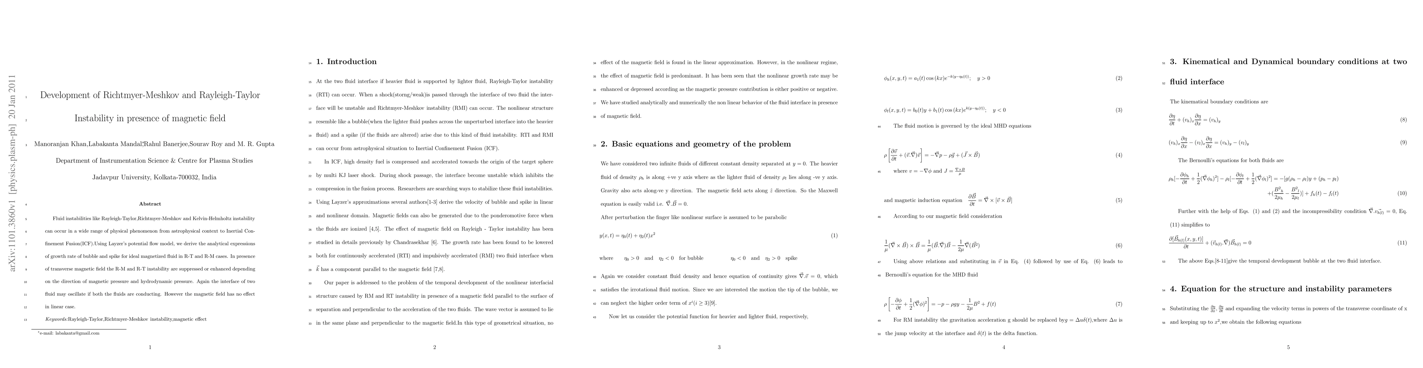 Fluid instabilities like Rayleigh-Taylor,Richtmyer-Meshkov and Kelvin-Helmholtz instability can occur in a wide range of physical phenomenon from astrophysical context to Inertial Confinement Fusion(ICF).Using Layzer's potential flow model, we derive the analytical expressions of growth rate of bubble and spike for ideal magnetized fluid in R-T and R-M cases. In presence of transverse magnetic field the R-M and R-T instability are suppressed or enhanced depending on the direction of magnetic pressure and hydrodynamic pressure. Again the interface of two fluid may oscillate if both the fluids are conducting. However the magnetic field has no effect in linear case.