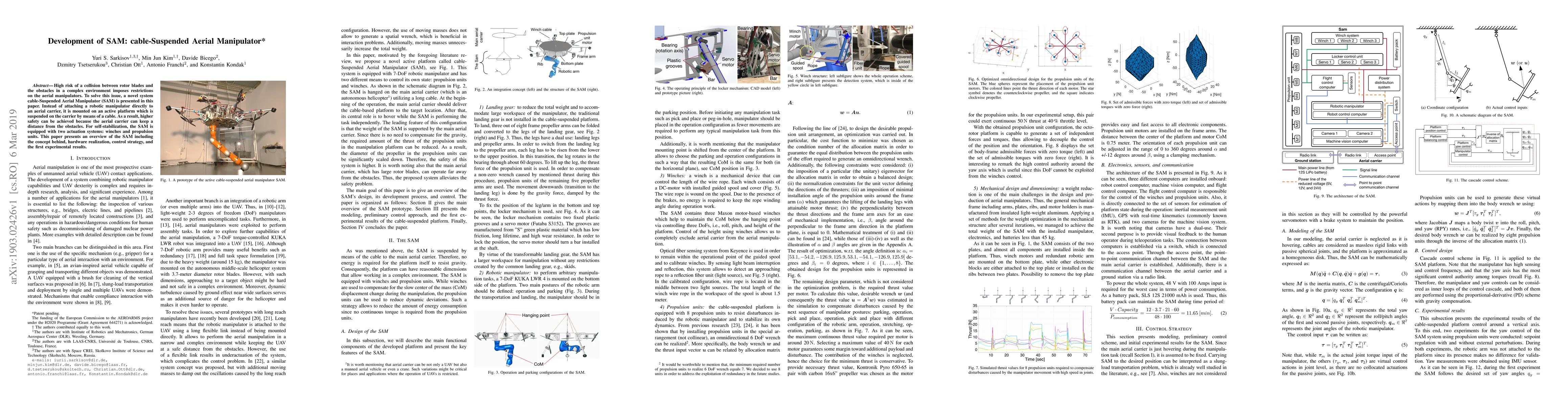 This paper introduces a novel cable-suspended aerial manipulator (SAM) designed to enhance safety by suspending the manipulator on a cable from the aerial carrier, thus avoiding collisions with obstacles. The SAM features winches and propulsion units for self-stabilization, and the paper provides an overview of its concept, hardware, control strategy, and initial experimental outcomes.