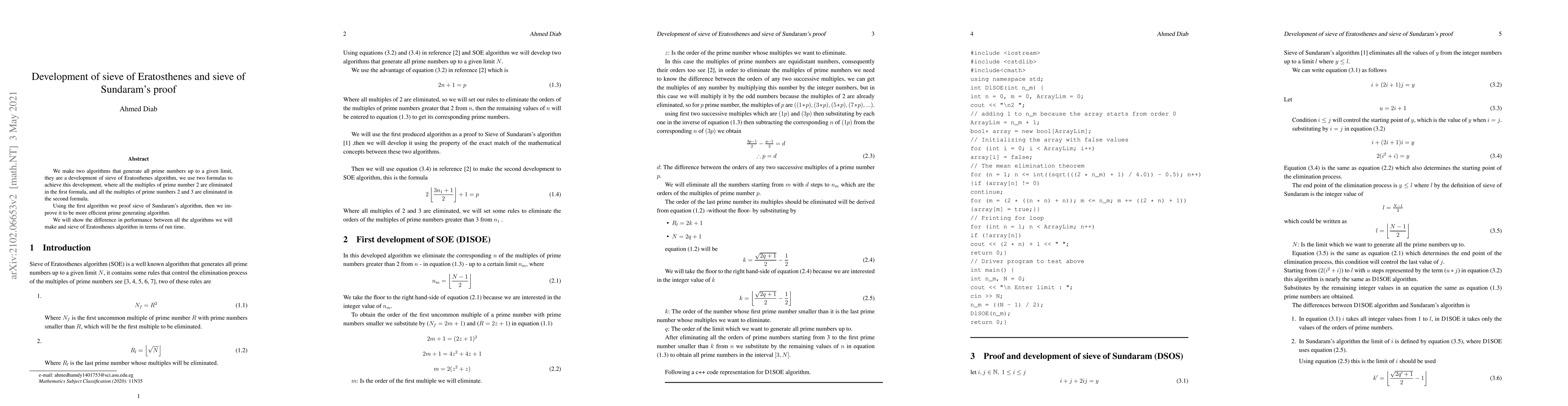 This paper develops two algorithms for generating prime numbers up to a given limit, building on the sieve of Eratosthenes. The first algorithm eliminates multiples of prime 2, while the second also removes multiples of prime 3. The paper proves and improves sieve of Sundaram's algorithm, and compares the performance of these new algorithms against the sieve of Eratosthenes in terms of runtime efficiency.