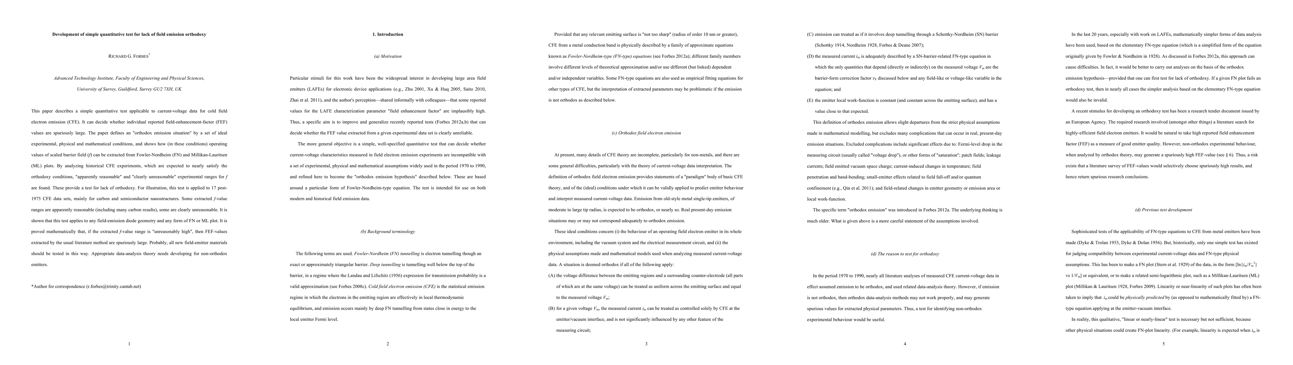 This paper describes a simple quantitative test applicable to current-voltage data for cold field electron emission (CFE). It can decide whether individual reported field-enhancement-factor (FEF) values are spuriously large. The paper defines an "orthodox emission situation" by a set of ideal experimental, physical and mathematical conditions, and shows how (in these conditions) operating values of scaled barrier field (f) can be extracted from Fowler-Nordheim (FN) and Millikan-Lauritsen (ML) plots. By analyzing historical CFE experiments, which are expected to nearly satisfy the orthodoxy conditions, "apparently reasonable" and "clearly unreasonable" experimental ranges for f are found. These provide a test for lack of orthodoxy. For illustration, this test is applied to 17 post-1975 CFE data sets, mainly for carbon and semiconductor nanostructures. Some extracted f-value ranges are apparently reasonable (including many carbon results), some are clearly unreasonable. It is shown that this test applies to any field-emission diode geometry and any form of FN or ML plot. It is proved mathematically that, if the extracted f-value range is "unreasonably high", then FEF-values extracted by the usual literature method are spuriously large. Probably, all new field-emitter materials should be tested in this way. Appropriate data-analysis theory needs developing for non-orthodox emitters.