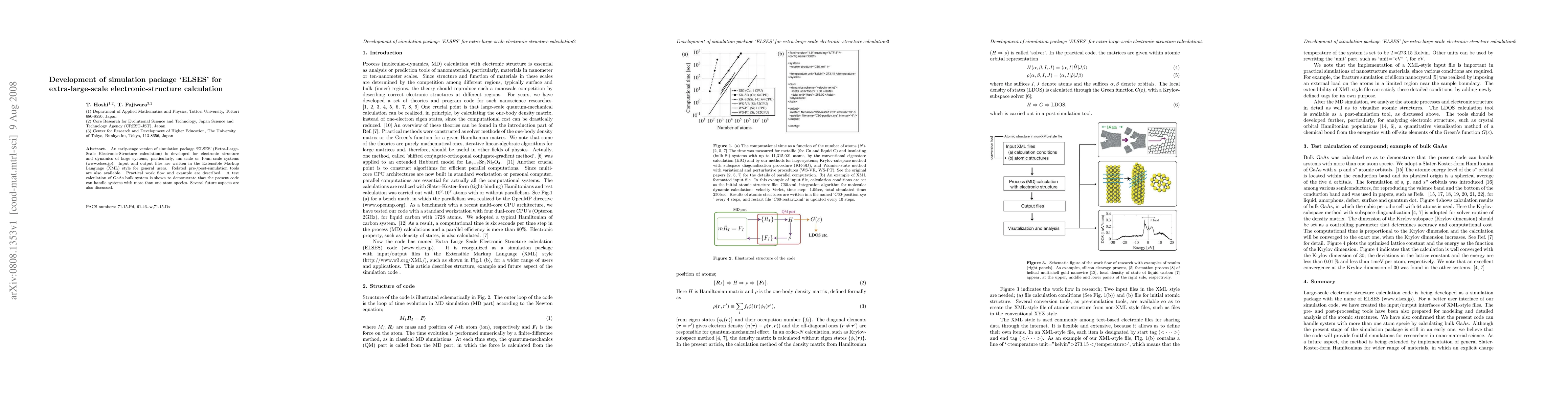 The paper introduces an early-stage version of the simulation package 'ELSES' for electronic-structure calculations of large nm-scale systems, featuring XML-style input/output files and related tools. A test calculation on GaAs demonstrates its capability to handle multi-species systems, with future developments discussed.