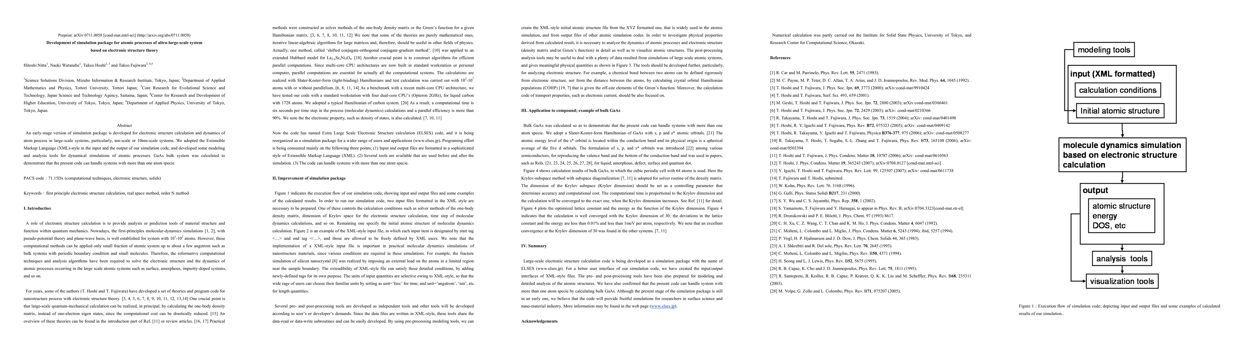 Summary: This paper introduces a simulation package for electronic structure calculations and dynamics of atomic processes in large-scale systems, utilizing XML-style input/output. The package was demonstrated using a GaAs bulk system, showing its capability to handle multi-atom species systems.