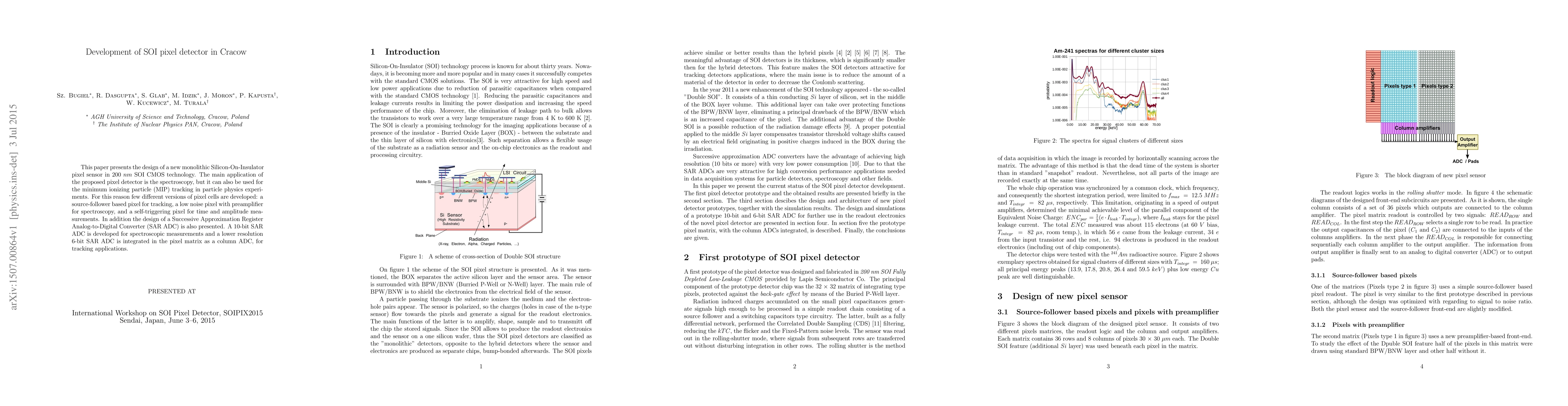 This paper presents the design of a new monolithic Silicon-On-Insulator pixel sensor in $200~nm$ SOI CMOS technology. The main application of the proposed pixel detector is the spectroscopy, but it can also be used for the minimum ionizing particle (MIP) tracking in particle physics experiments. For this reason few different versions of pixel cells are developed: a source-follower based pixel for tracking, a low noise pixel with preamplifier for spectroscopy, and a self-triggering pixel for time and amplitude measurements. In addition the design of a Successive Approximation Register Analog-to-Digital Converter (SAR ADC) is also presented. A 10-bit SAR ADC is developed for spectroscopic measurements and a lower resolution 6-bit SAR ADC is integrated in the pixel matrix as a column ADC, for tracking applications.