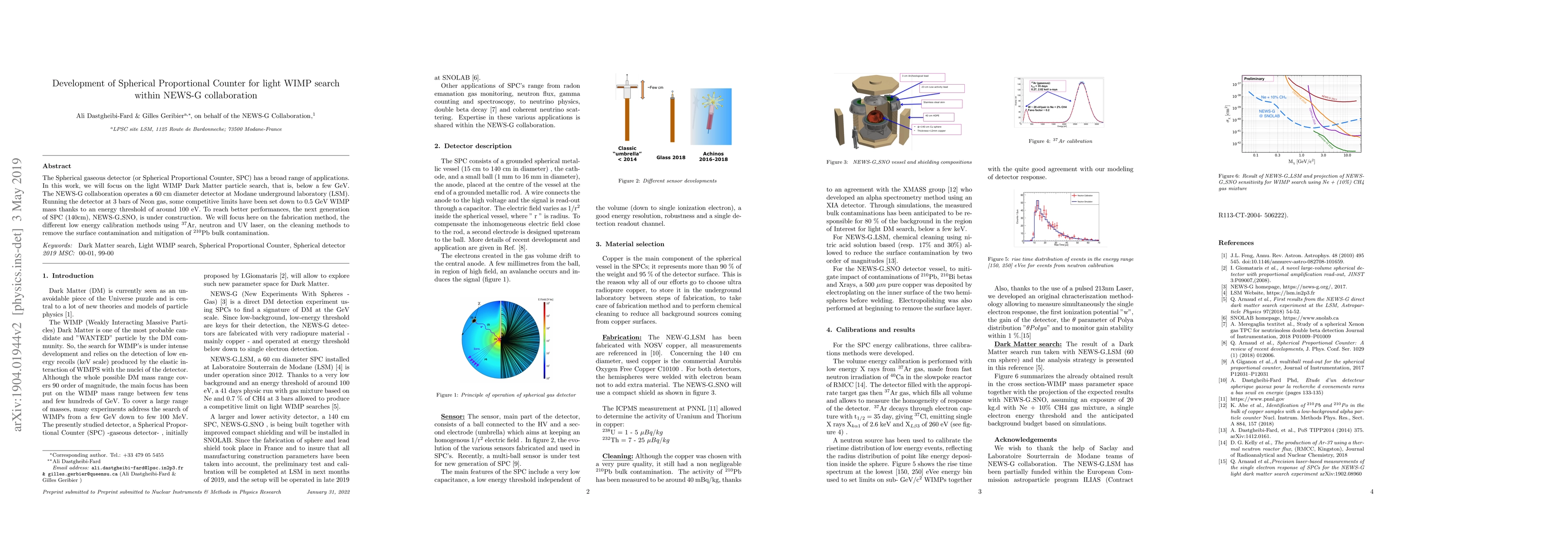 This paper details the development of a spherical proportional counter (SPC) for detecting light Weakly Interacting Massive Particles (WIMPs) within the NEWS-G collaboration. The current 60 cm detector has set competitive limits for WIMP masses below 0.5 GeV, and a new 140 cm SPC, NEWS-G SNO, is under construction, focusing on fabrication, calibration, and contamination mitigation techniques.