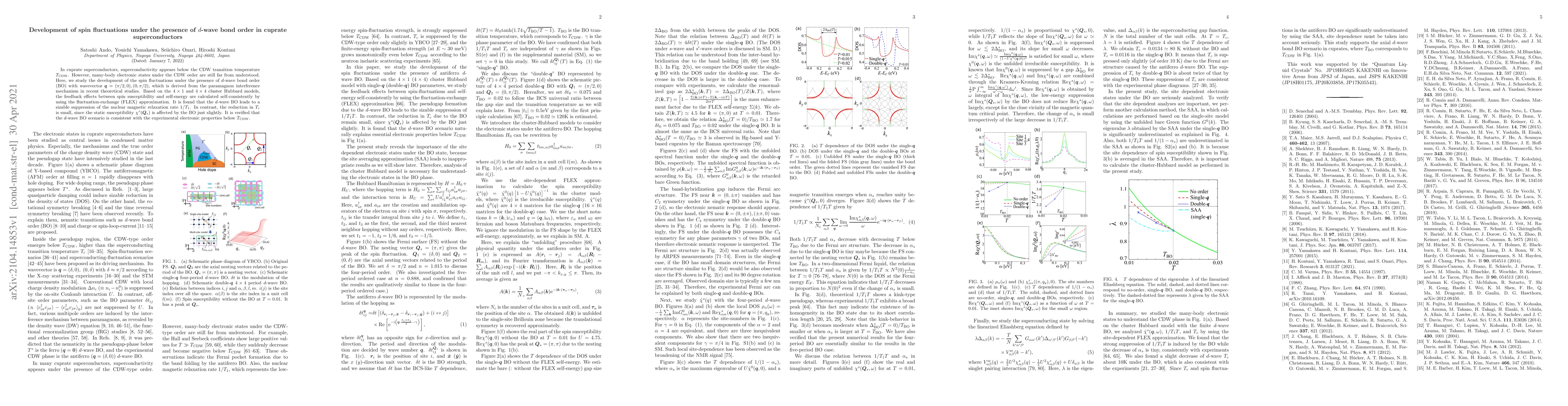 In cuprate superconductors, superconductivity appears below the CDW transition temperature $T_{CDW}$. However, many-body electronic states under the CDW order are still far from understood. Here, we study the development of the spin fluctuations under the presence of $d$-wave bond order (BO) with wavevector $q=(\pi/2,0),(0,\pi/2)$, which is derived from the paramagnon interference mechanism in recent theoretical studies. Based on the $4 \times 1$ and $4 \times 4$ cluster Hubbard models, the feedback effects between spin susceptibility and self-energy are calculated self-consistently by using the fluctuation-exchange (FLEX) approximation. It is found that the $d$-wave BO leads to a sizable suppression of the nuclear magnetic relaxation rate $1/T_1$. In contrast, the reduction in $T_c$ is small, since the static susceptibility $\chi^s(Q_s)$ is affected by the BO just slightly. It is verified that the $d$-wave BO scenario is consistent with the experimental electronic properties below $T_{CDW}$.