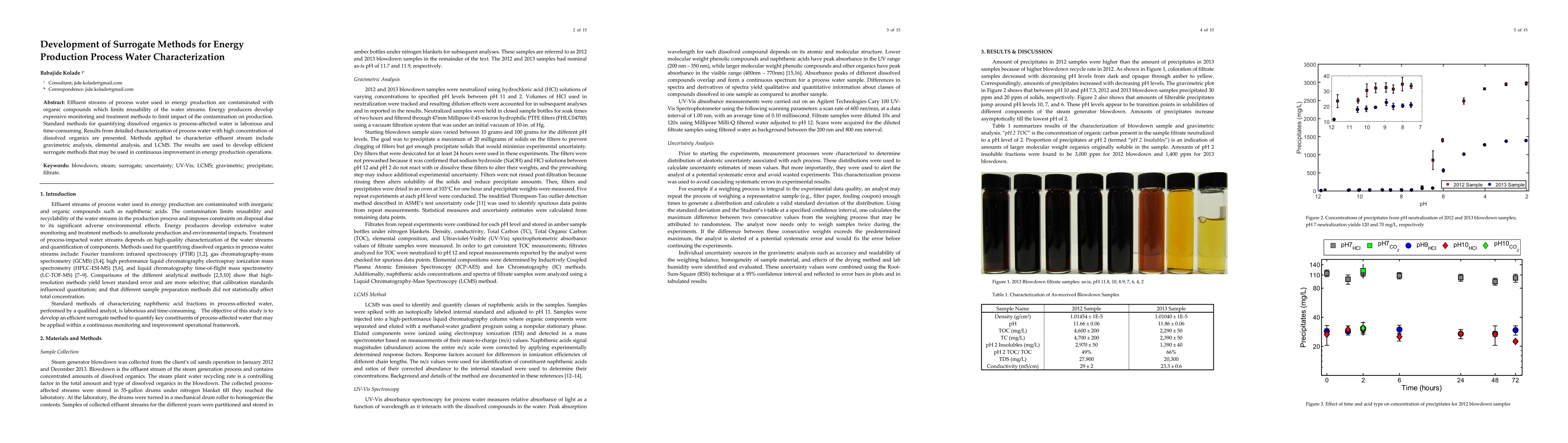 Effluent streams of process water used in energy production are contaminated with organic compounds which limits reusability of the water streams. Energy producers develop expensive monitoring and treatment methods to limit impact of the contamination on production. Standard methods for quantifying dissolved organics is process-affected water is laborious and time-consuming. Results from detailed characterization of process water with high concentration of dissolved organics are presented. Methods applied to characterize effluent stream include gravimetric analysis, elemental analysis, and LCMS. The results are used to develop efficient surrogate methods that may be used in continuous improvement in energy production operations.