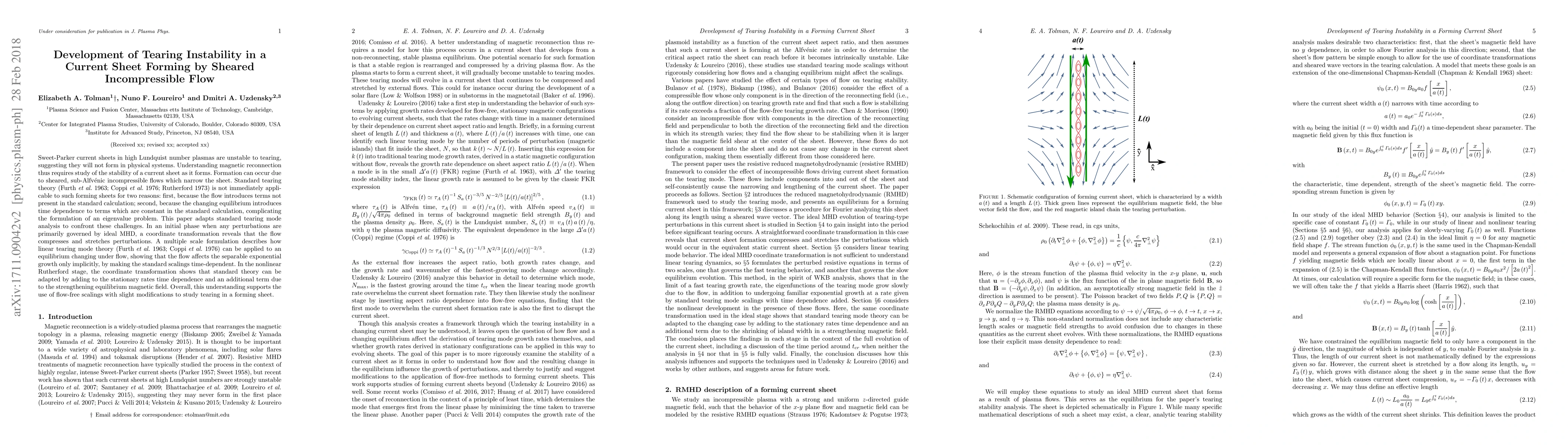 Sweet-Parker current sheets in high Lundquist number plasmas are unstable to tearing, suggesting they will not form in physical systems. Understanding magnetic reconnection thus requires study of the stability of a current sheet as it forms. Formation can occur due to sheared, sub-Alfv\'enic incompressible flows which narrow the sheet. Standard tearing theory (Furth et al. 1963; Coppi et al. 1976; Rutherford 1973) is not immediately applicable to such forming sheets for two reasons: first, because the flow introduces terms not present in the standard calculation; second, because the changing equilibrium introduces time dependence to terms which are constant in the standard calculation, complicating the formulation of an eigenvalue problem. This paper adapts standard tearing mode analysis to confront these challenges. In an initial phase when any perturbations are primarily governed by ideal MHD, a coordinate transformation reveals that the flow compresses and stretches perturbations. A multiple scale formulation describes how linear tearing mode theory (Furth et al. 1963; Coppi et al. 1976) can be applied to an equilibrium changing under flow, showing that the flow affects the separable exponential growth only implicitly, by making the standard scalings time-dependent. In the nonlinear Rutherford stage, the coordinate transformation shows that standard theory can be adapted by adding to the stationary rates time dependence and an additional term due to the strengthening equilibrium magnetic field. Overall, this understanding supports the use of flow-free scalings with slight modifications to study tearing in a forming sheet.