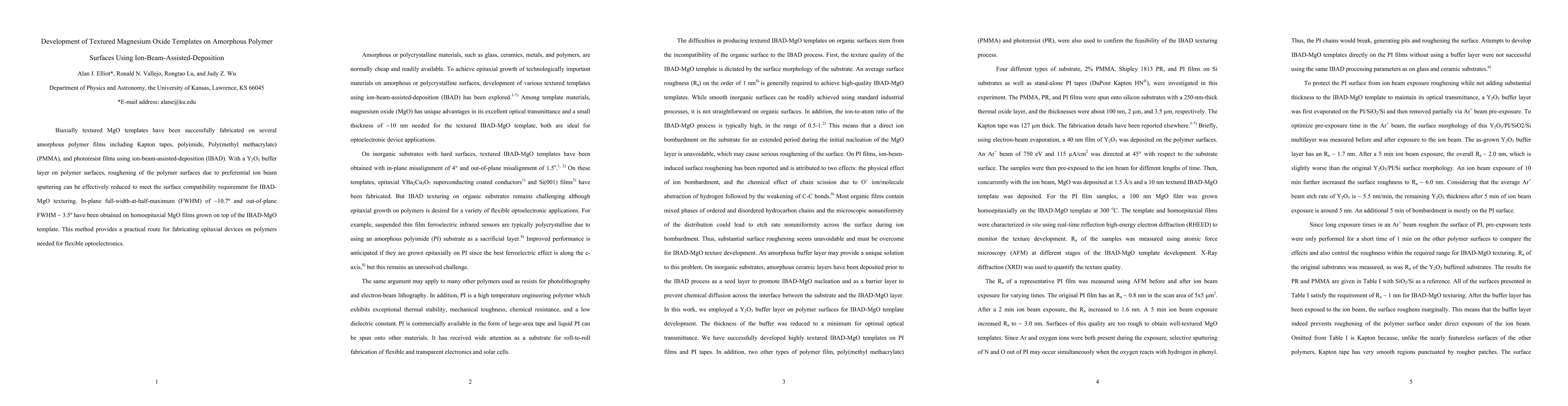 This paper details the successful fabrication of biaxially textured magnesium oxide (MgO) templates on amorphous polymer films via ion-beam-assisted-deposition (IBAD), using a Y2O3 buffer layer to reduce surface roughening. The method achieves epitaxial growth with in-plane and out-of-plane full-width-at-half-maximum (FWHM) values of ~10.7 and ~3.5 degrees, respectively, enabling flexible optoelectronics applications.