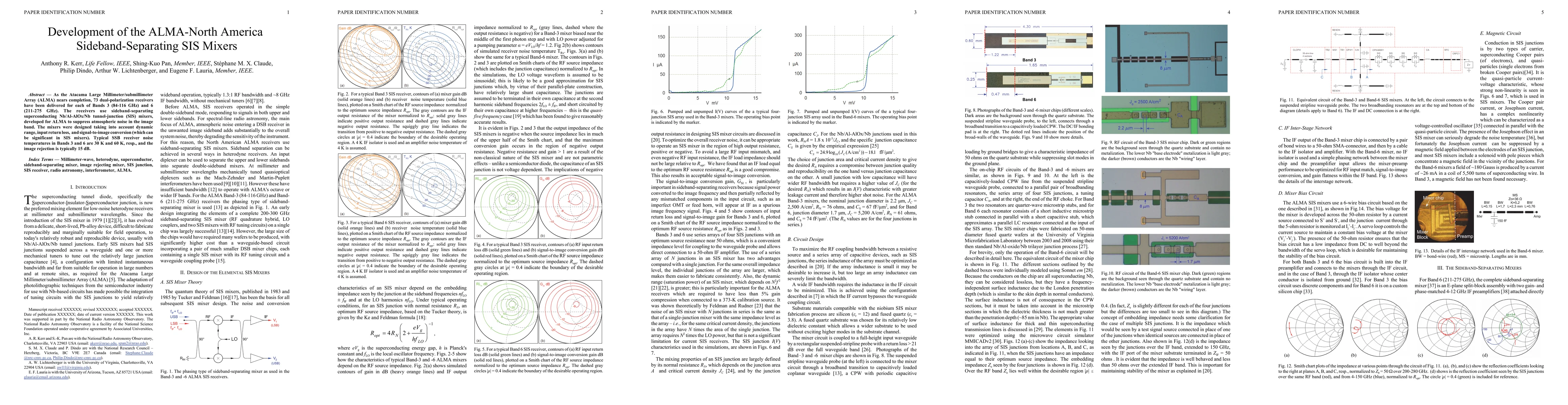 This paper details the development of sideband-separating SIS mixers for ALMA's dual-polarization receivers, designed to minimize atmospheric noise with noise temperatures of 30 K and 60 K in Bands 3 and 6, respectively, and an image rejection of 15 dB.