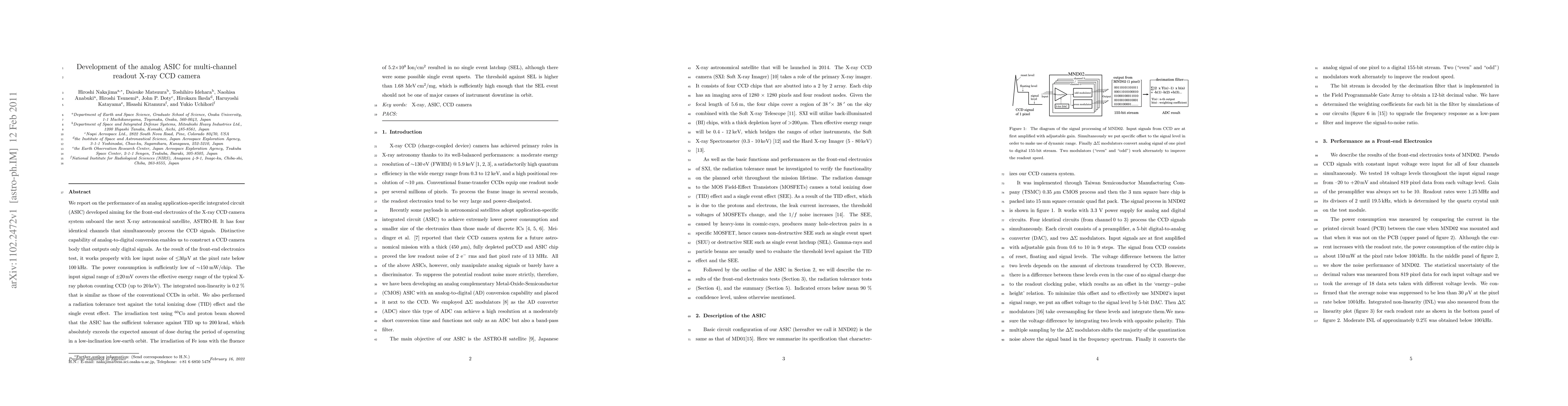 This paper details the development of an analog ASIC for multi-channel readout in X-ray CCD cameras, designed for the ASTRO-H X-ray satellite. The ASIC features low input noise, low power consumption, and high radiation tolerance, ensuring reliable performance in space environments.