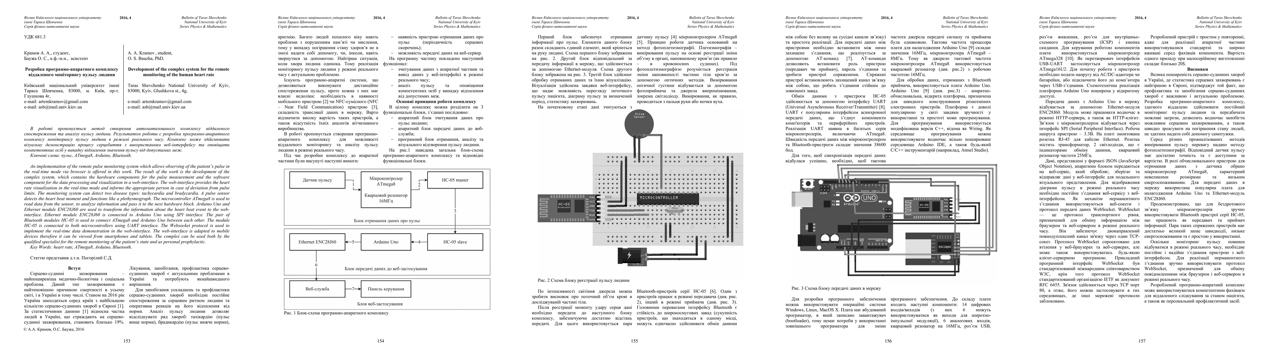 An implementation of the remote pulse monitoring system which allows observing of the patient's pulse in a real-time mode via browser is offered in this work. The result of the work is the development of the complex system, which contains the hardware components for the pulse measurement and the software component for the data processing and visualization in a web-interface. The web-interface provides the heart rate visualization in real-time mode and informs the appropriate person in case of deviation from pulse limits. The monitoring system can detect two disease types: tachycardia and bradycardia. A pulse sensor detects the heartbeat moment and functions like a plethysmograph. The microcontroller ATmega8 is used to read data from the sensor, to analyze information, and pass it to the next hardware block. Arduino Uno and Ethernet module ENC28J60 are used to transform the information about the heartbeat event to the web interface. Ethernet module ENC28J60 is connected to Arduino Uno using the SPI interface. The pair of Bluetooth modules HC-05 is used to connect ATmega8 and Arduino Uno with each other. The module HC-05 is connected to both microcontrollers using the UART interface. The WebSocket protocol is used to implement the real-time data demonstration in the web-interface. The web-interface is adapted to mobile devices therefore it can be viewed from smartphones and tablets. The complex can be used both by the qualified specialist for the remote monitoring of the patient's state and as a personal prophylactic
