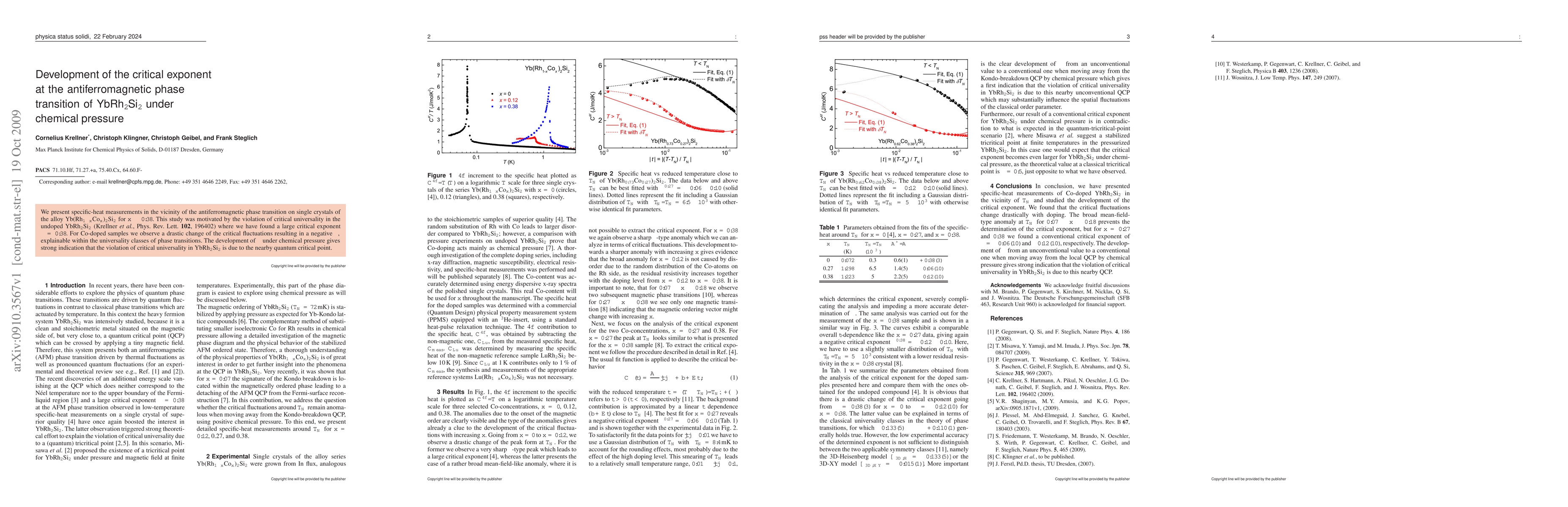 This study investigates specific-heat changes near the antiferromagnetic phase transition of Yb(Rh_{1-x}Co_x)2Si2 under chemical pressure, revealing a shift from a large critical exponent a=0.38 in undoped YbRh2Si2 to a negative a in Co-doped samples, suggesting the influence of a nearby quantum critical point.