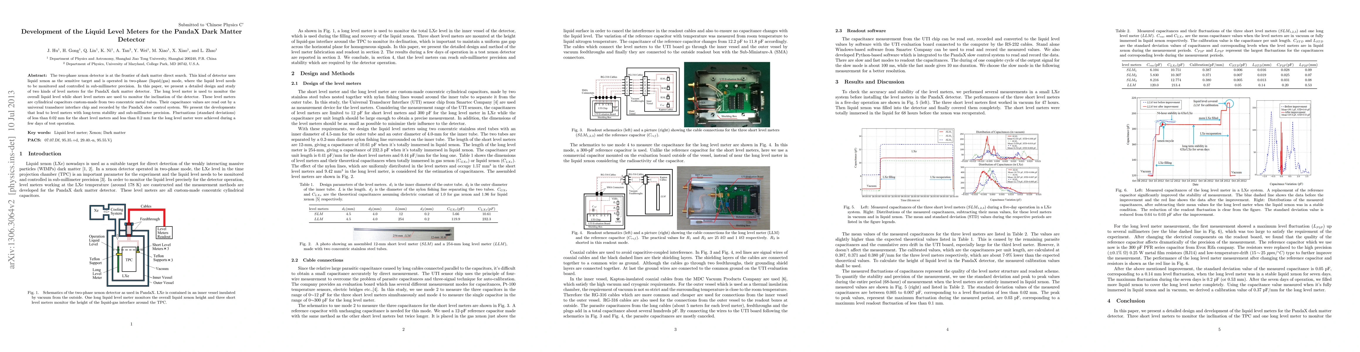 The two-phase xenon detector is at the frontier of dark matter direct search. This kind of detector uses liquid xenon as the sensitive target and is operated in two-phase (liquid/gas) mode, where the liquid level needs to be monitored and controlled in sub-millimeter precision. In this paper, we present a detailed design and study of two kinds of level meters for the PandaX dark matter detector. The long level meter is used to monitor the overall liquid level while short level meters are used to monitor the inclination of the detector. These level meters are cylindrical capacitors custom-made from two concentric metal tubes. Their capacitance values are read out by a universal transducer interface chip and recorded by the PandaX slow control system. We present the developments that lead to level meters with long-term stability and sub-millimeter precision. Fluctuations (standard deviations) of less than 0.02 mm for the short level meters and less than 0.2 mm for the long level meter were achieved during a few days of test operation.