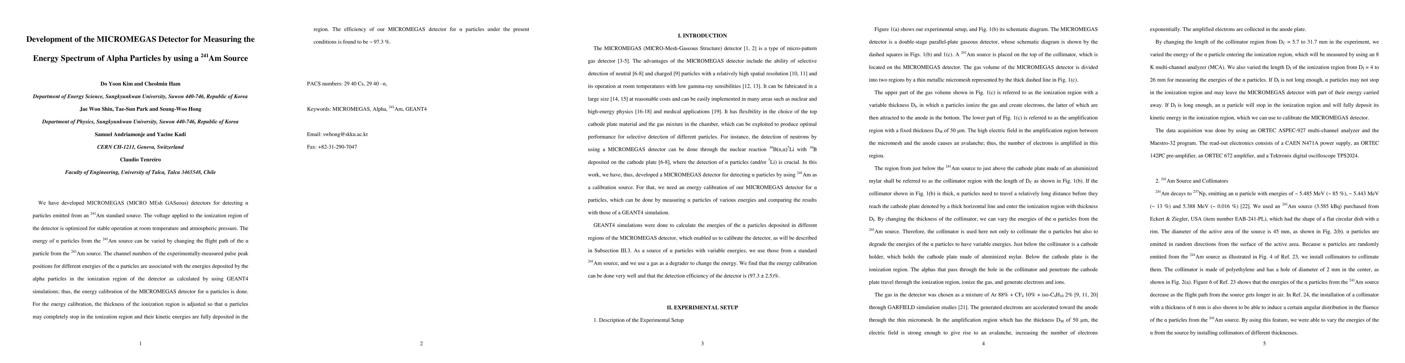 The research developed MICROMEGAS detectors for alpha particle detection from a 241-Am source, optimizing voltage for stable operation. The detector's energy calibration was achieved through GEANT4 simulations correlating pulse peak positions with alpha particle energies, yielding an efficiency of ~97.3%.