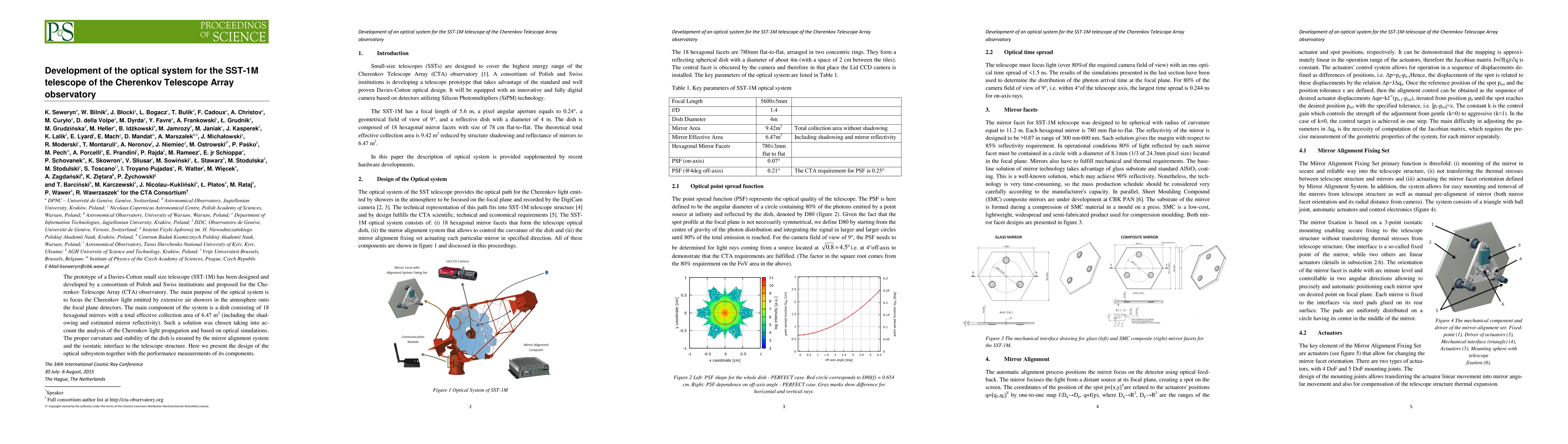 The SST-1M telescope prototype for the Cherenkov Telescope Array uses a hexagonal mirror dish to focus Cherenkov light onto detectors, with an effective collection area of 6.47 m2 and an isostatic interface for stability. Performance measurements confirm the optical subsystem's design.