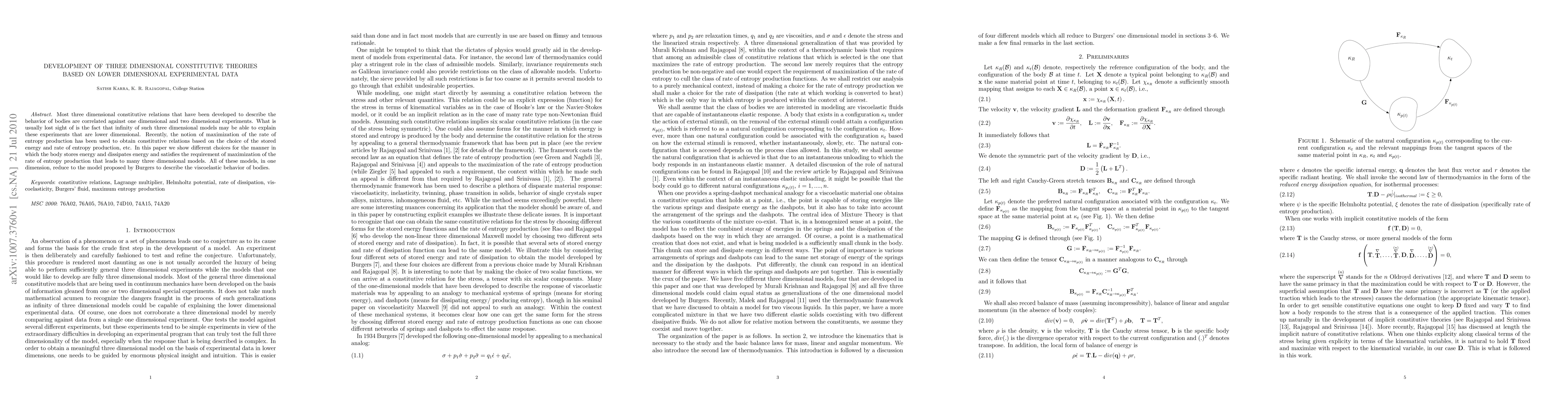 Most three dimensional constitutive relations that have been developed to describe the behavior of bodies are correlated against one dimensional and two dimensional experiments. What is usually lost sight of is the fact that infinity of such three dimensional models may be able to explain these experiments that are lower dimensional. Recently, the notion of maximization of the rate of entropy production has been used to obtain constitutive relations based on the choice of the stored energy and rate of entropy production, etc. In this paper we show different choices for the manner in which the body stores energy and dissipates energy and satisfies the requirement of maximization of the rate of entropy production that leads to many three dimensional models. All of these models, in one dimension, reduce to the model proposed by Burgers to describe the viscoelastic behavior of bodies.