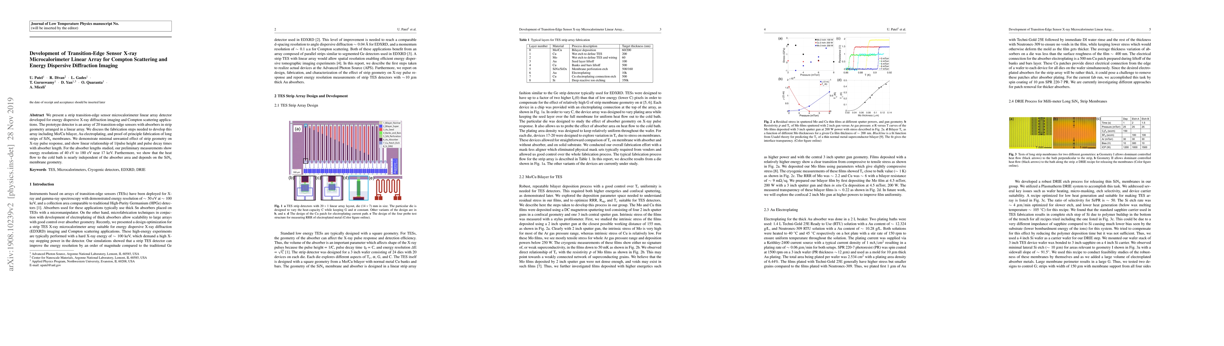 We present a strip transition-edge sensor microcalorimeter linear array detector developed for energy dispersive X-ray diffraction imaging and Compton scattering applications. The prototype detector is an array of 20 transition-edge-sensors with absorbers in strip geometry arranged in a linear array. We discuss the fabrication steps needed to develop this array including Mo/Cu bilayer, Au electroplating, and proof-of-principle fabrication of long strips of SiNx membranes. We demonstrate minimal unwanted effect of strip geometry on X-ray pulse response, and show linear relationship of 1/pulse height and pulse decay times with absorber length. For the absorber lengths studied, preliminary measurements show energy resolutions of 40 eV to 180 eV near 17 keV. Furthermore, we show that the heat flow to the cold bath is nearly independent of the absorber area and depends on the SiNx membrane geometry.