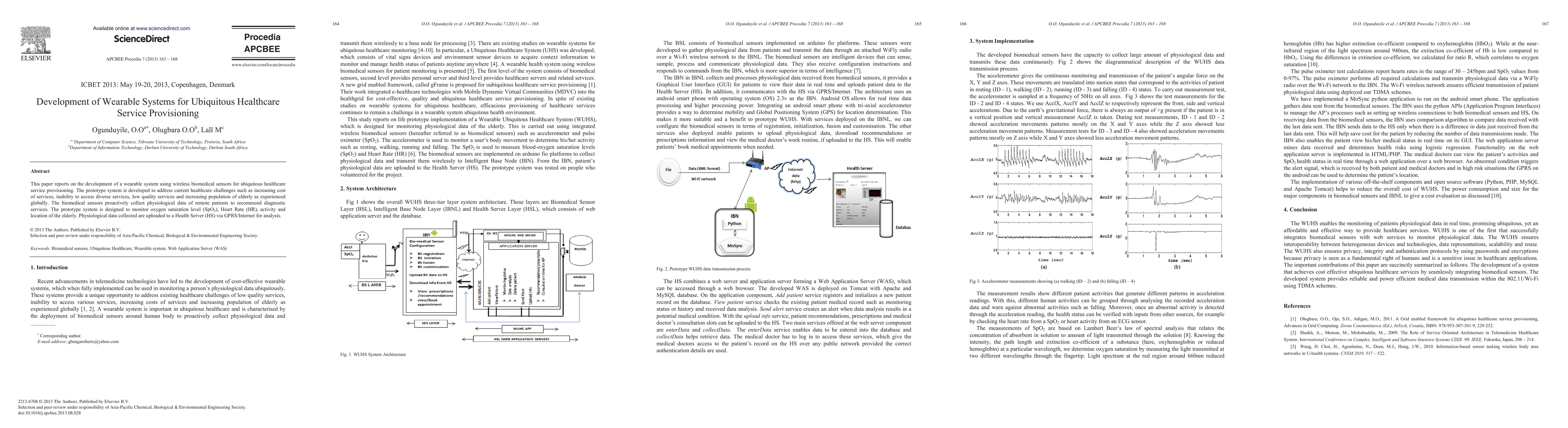 This paper reports on the development of a wearable system using wireless biomedical sensors for ubiquitous healthcare service provisioning. The prototype system is developed to address current healthcare challenges such as increasing cost of services, inability to access diverse services, low quality services and increasing population of elderly as experienced globally. The biomedical sensors proactively collect physiological data of remote patients to recommend diagnostic services. The prototype system is designed to monitor oxygen saturation level (SpO2), Heart Rate (HR), activity and location of the elderly. Physiological data collected are uploaded to a Health Server (HS) via GPRS/Internet for analysis.