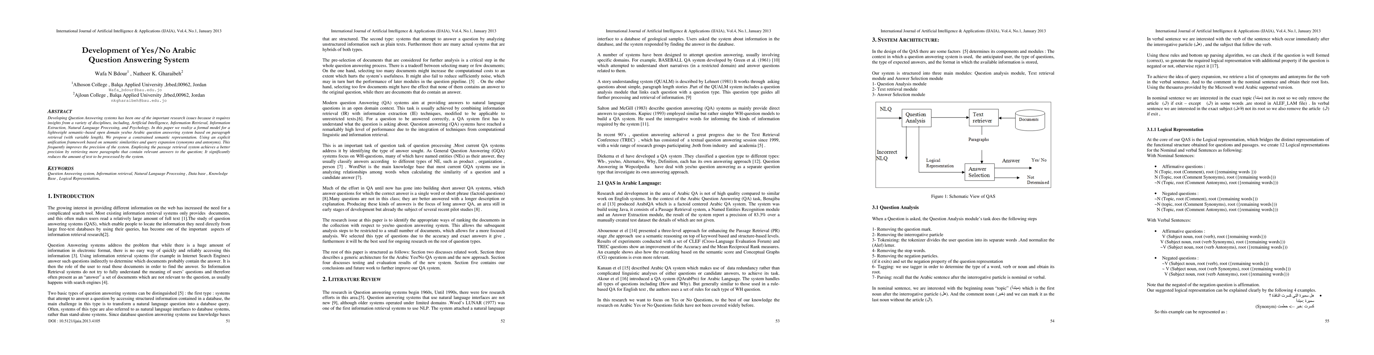 This paper develops a lightweight semantic-based Arabic yes/no question answering system using paragraph retrieval and variable length. It employs a constrained semantic representation and query expansion techniques to improve precision and reduce text processing.