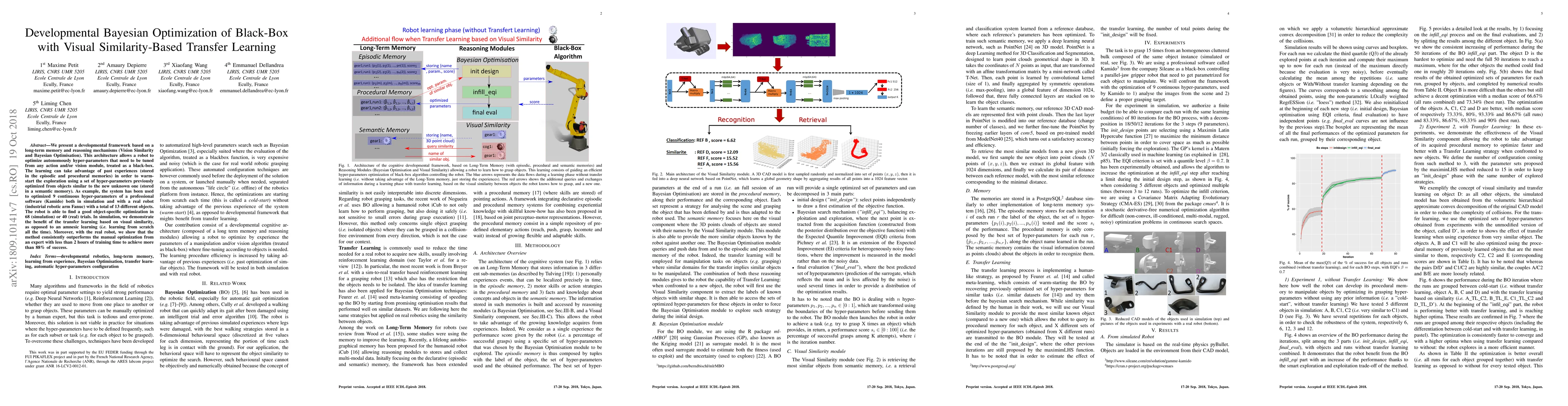 We present a developmental framework based on a long-term memory and reasoning mechanisms (Vision Similarity and Bayesian Optimisation). This architecture allows a robot to optimize autonomously hyper-parameters that need to be tuned from any action and/or vision module, treated as a black-box. The learning can take advantage of past experiences (stored in the episodic and procedural memories) in order to warm-start the exploration using a set of hyper-parameters previously optimized from objects similar to the new unknown one (stored in a semantic memory). As example, the system has been used to optimized 9 continuous hyper-parameters of a professional software (Kamido) both in simulation and with a real robot (industrial robotic arm Fanuc) with a total of 13 different objects. The robot is able to find a good object-specific optimization in 68 (simulation) or 40 (real) trials. In simulation, we demonstrate the benefit of the transfer learning based on visual similarity, as opposed to an amnesic learning (i.e. learning from scratch all the time). Moreover, with the real robot, we show that the method consistently outperforms the manual optimization from an expert with less than 2 hours of training time to achieve more than 88% of success.