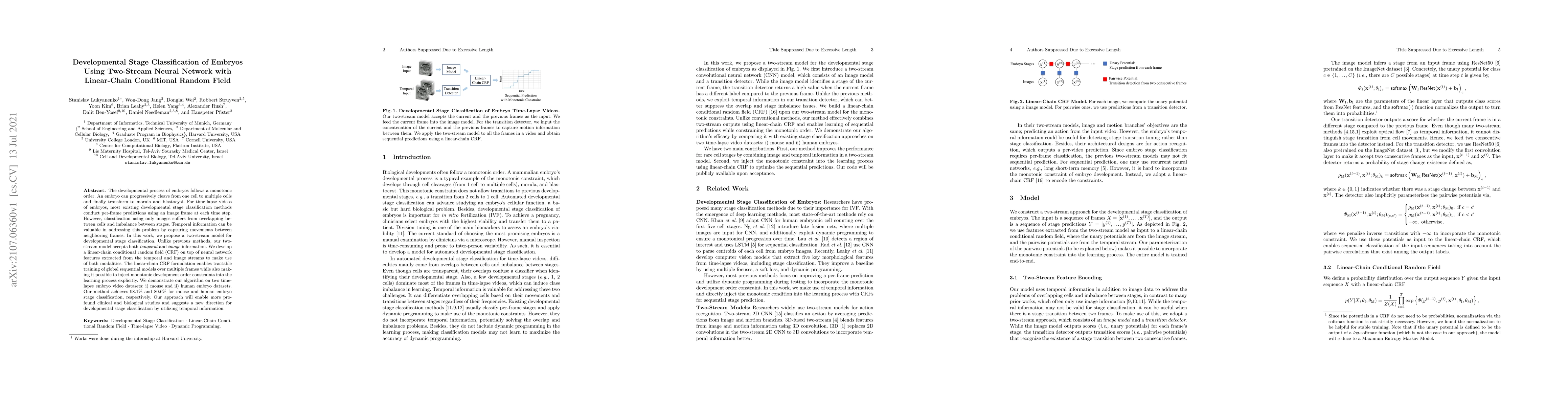 This paper proposes a two-stream neural network model incorporating temporal and image information for classifying developmental stages of embryos using time-lapse videos. It employs a linear-chain CRF to integrate both modalities and enforce monotonic development constraints, achieving 98.1% and 80.6% accuracy on mouse and human embryo datasets, respectively.