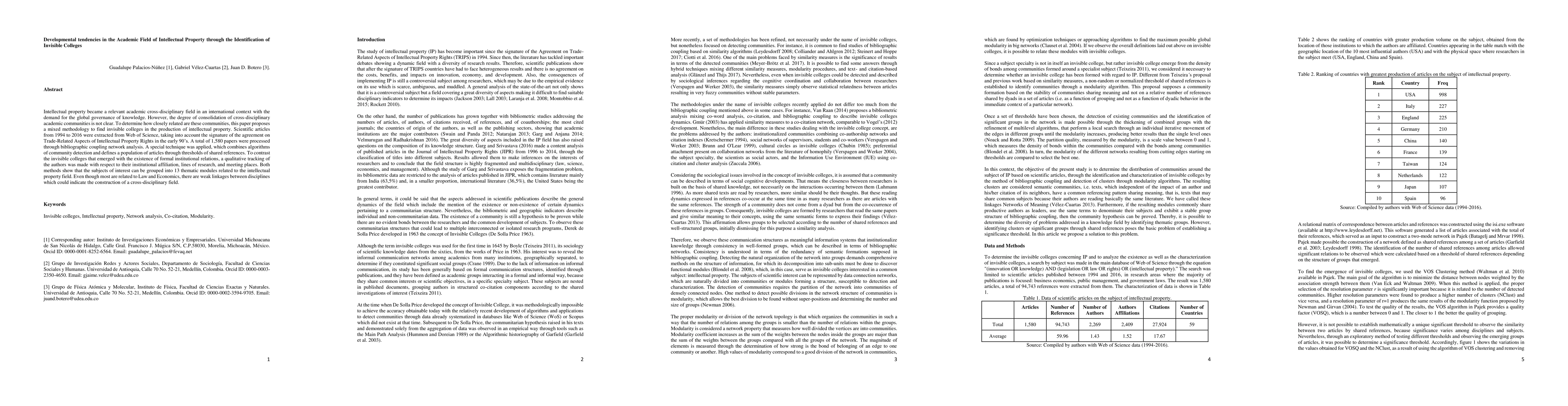 The emergence of intellectual property as an academic issue opens a big gate to a cross-disciplinary field. Different disciplines start a dialogue in the framework of the international multilateral treaties in the early 90's. As global economy demands new knowledge on intellectual property, Science grows at its own pace. However, the degree of consolidation of cross-disciplinary academic communities is not clear. In order to know how closely related are these communities, this paper proposes a mixed methodology to find invisible colleges in the production about intellectual property. The articles examined in this paper were extracted from Web of Science. The analyzed period was from 1994 to 2016, taking into account the signature of the agreement on Trade-Related Aspects of Intellectual Property Rights in the early 90's. A total amount of 1580 papers were processed through co-citation network analysis. An especial technique, which combine algorithms of community detection and defining population of articles through thresholds of shared references, was applied. In order to contrast the invisible colleges that emerged with the existence of formal institutional relations, it was made a qualitative tracking of the authors with respect to their institutional affiliation, lines of research and meeting places. Both methods show that the subjects of interest can be grouped into 13 different issues related to intellectual property field. Even though most of them are related to Laws and Economics, there are weak linkages between disciplines which could indicate the construction of a cross-disciplinary field.