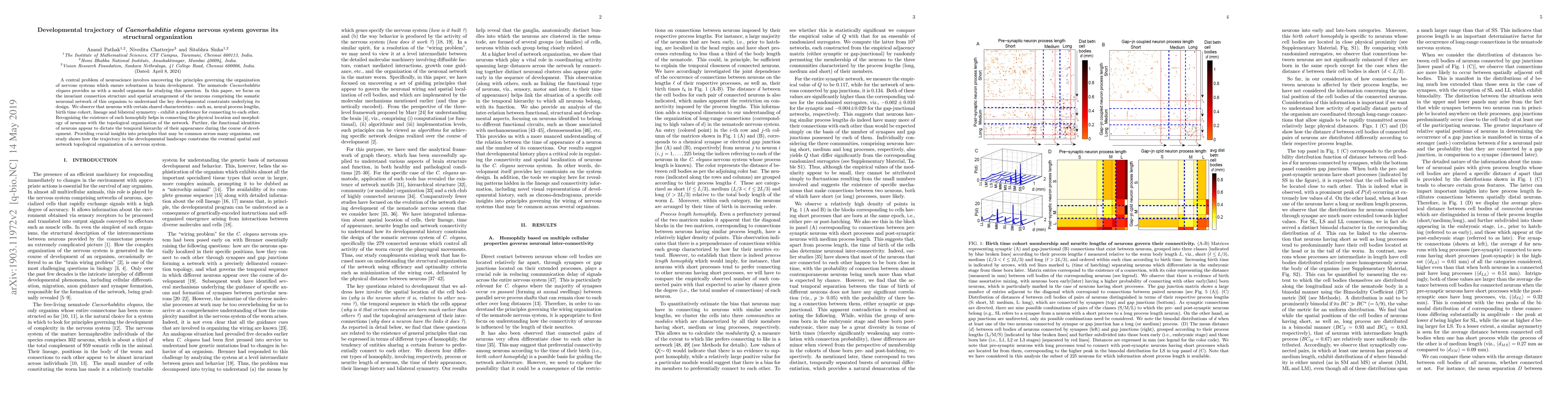A central problem of neuroscience involves uncovering the principles governing the organization of nervous systems which ensure robustness in brain development. The nematode Caenorhabditis elegans provides us with a model organism for studying this question. In this paper, we focus on the invariant connection structure and spatial arrangement of the neurons comprising the somatic neuronal network of this organism to understand the key developmental constraints underlying its design. We observe that neurons with certain shared characteristics - such as, neural process lengths, birth time cohort, lineage and bilateral symmetry - exhibit a preference for connecting to each other. Recognizing the existence of such homophily helps in connecting the physical location and morphology of neurons with the topological organization of the network. Further, the functional identities of neurons appear to dictate the temporal hierarchy of their appearance during the course of development. Providing crucial insights into principles that may be common across many organisms, our study shows how the trajectory in the developmental landscape constrains the eventual spatial and network topological organization of a nervous system.
