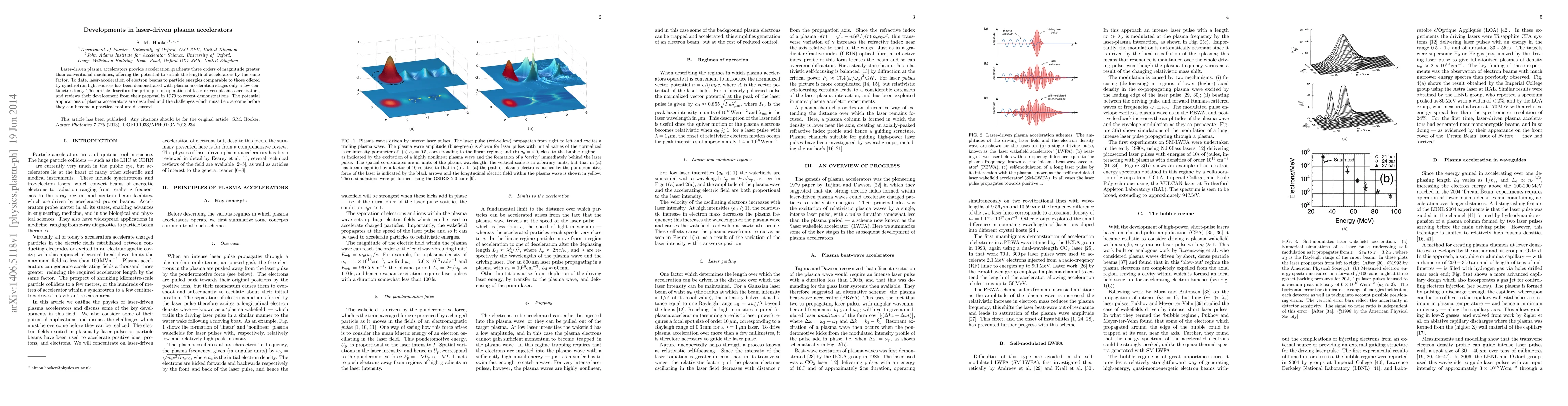 The paper provides a comprehensive review of laser-driven plasma accelerator schemes, their development, and potential applications, highlighting advancements in plasma wakefield acceleration and near-monoenergetic electron beam generation.