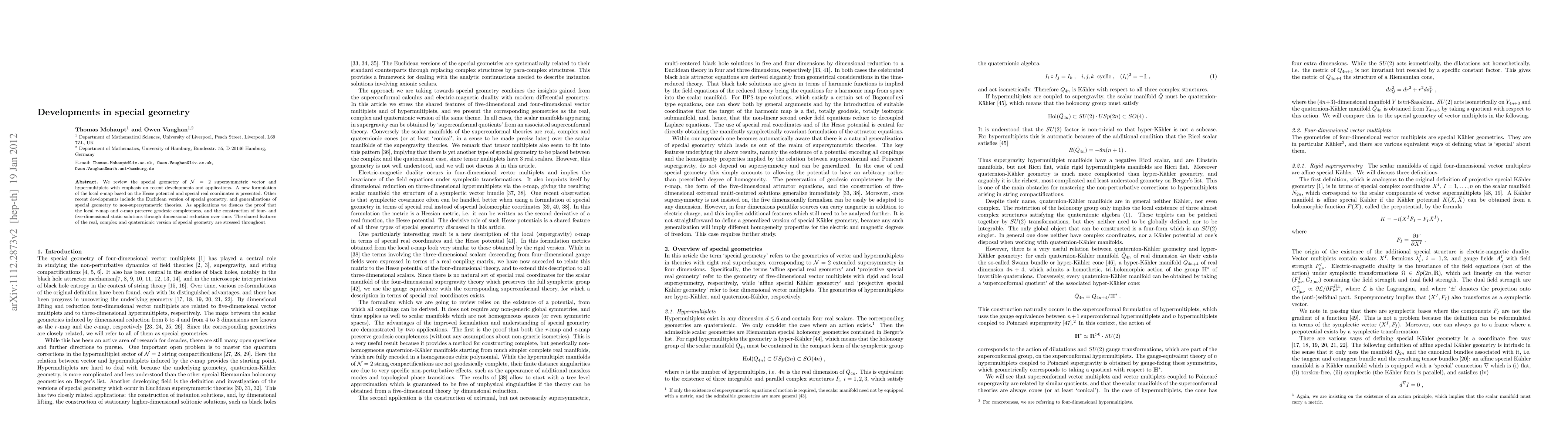 This paper reviews recent developments in special geometry, including new formulations of the local c-map and applications to supersymmetric vector and hypermultiplets, static solutions, and dimensional reduction over time.