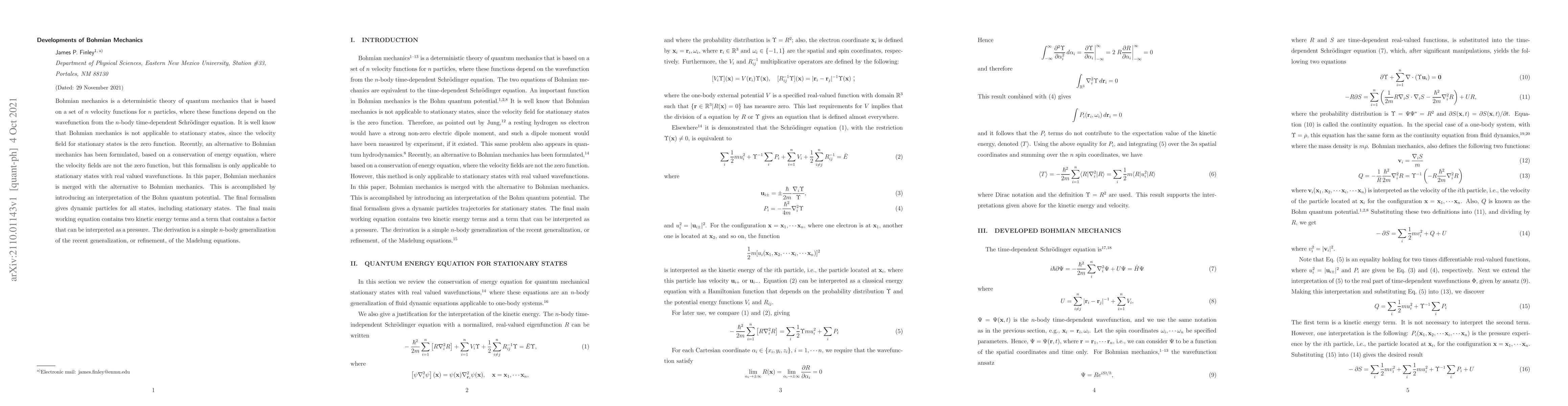 Bohmian mechanics is a deterministic theory of quantum mechanics that is based on a set of n velocity functions for n particles, where these functions depend on the wavefunction from the n-body time-dependent Schroedinger equation. It is well know that Bohmian mechanics is not applicable to stationary states, since the velocity field for stationary states is the zero function. Recently, an alternative to Bohmian mechanics has been formulated, based on a conservation of energy equation, where the velocity fields are not the zero function, but this formalism is only applicable to stationary states with real valued wavefunctions. In this paper, Bohmian mechanics is merged with the alternative to Bohmian mechanics. This is accomplished by introducing an interpretation of the Bohm quantum potential. The final formalism gives dynamic particles for all states, including stationary states. The final main working equation contains two kinetic energy terms and a term that contains a factor that can be interpreted as a pressure. The derivation is a simple n-body generalization of the recent generalization, or refinement, of the Madelung equations.