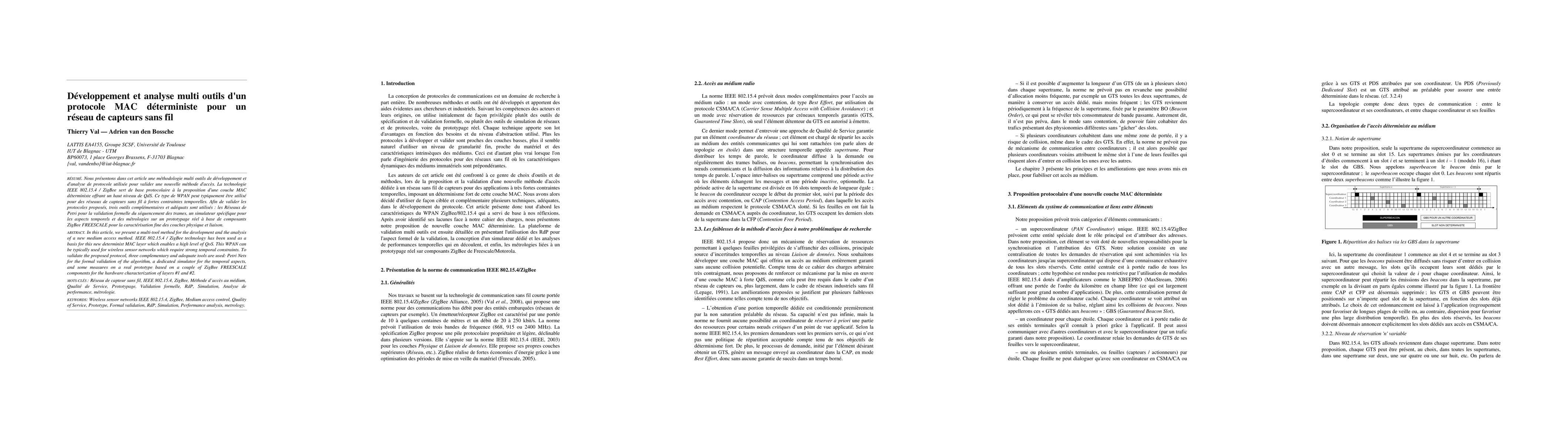 In this article, we present a multi-tool method for the development and the analysis of a new medium access method. IEEE 802.15.4 / ZigBee technology has been used as a basis for this new determinist MAC layer which enables a high level of QoS. This WPAN can be typically used for wireless sensor networks which require strong temporal constraints. To validate the proposed protocol, three complementary and adequate tools are used: Petri Nets for the formal validation of the algorithm, a dedicated simulator for the temporal aspects, and some measures on a real prototype based on a couple of ZigBee FREESCALE components for the hardware characterization of layers #1 and #2.