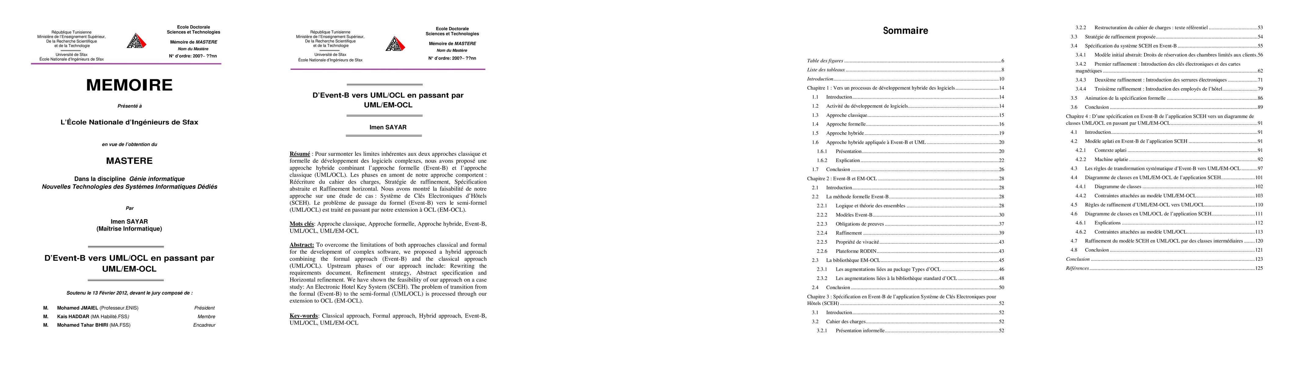 To overcome the limitations of both approaches classical and formal for the development of complex software, we proposed a hybrid approach combining the formal approach (Event-B) and the classical approach (UML/OCL). Upstream phases of our approach include: Rewriting the requirements document, Refinement strategy, Abstract specification and Horizontal refinement. We have shown the feasibility of our approach on a case study: An Electronic Hotel Key System (SCEH). The problem of transition from the formal (Event-B) to the semi-formal (UML/OCL) is processed through our extension to OCL (EM-OCL).