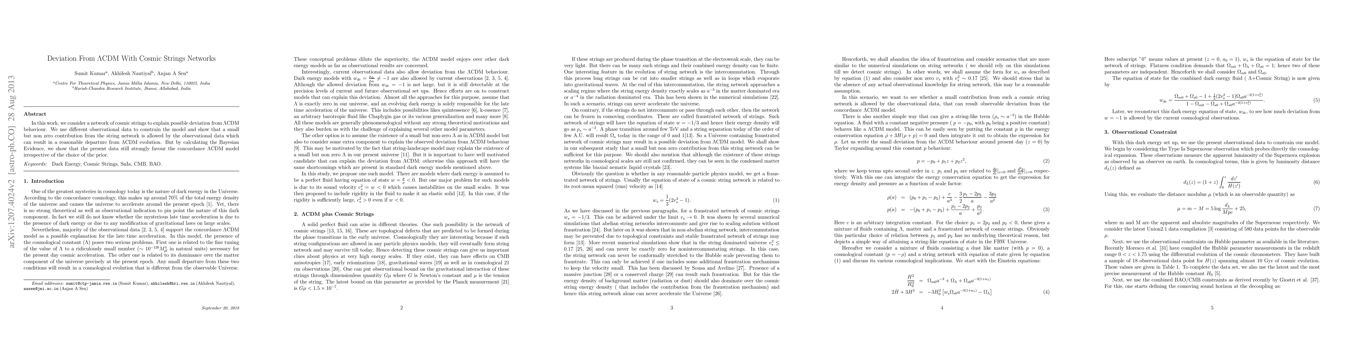 In this work, we consider a network of cosmic strings to explain possible deviation from \Lambda CDM behaviour. We use different observational data to constrain the model and show that a small but non zero contribution from the string network is allowed by the observational data which can result in a reasonable departure from \Lambda CDM evolution. But by calculating the Bayesian Evidence, we show that the present data still strongly favour the concordance \Lambda CDM model irrespective of the choice of the prior.