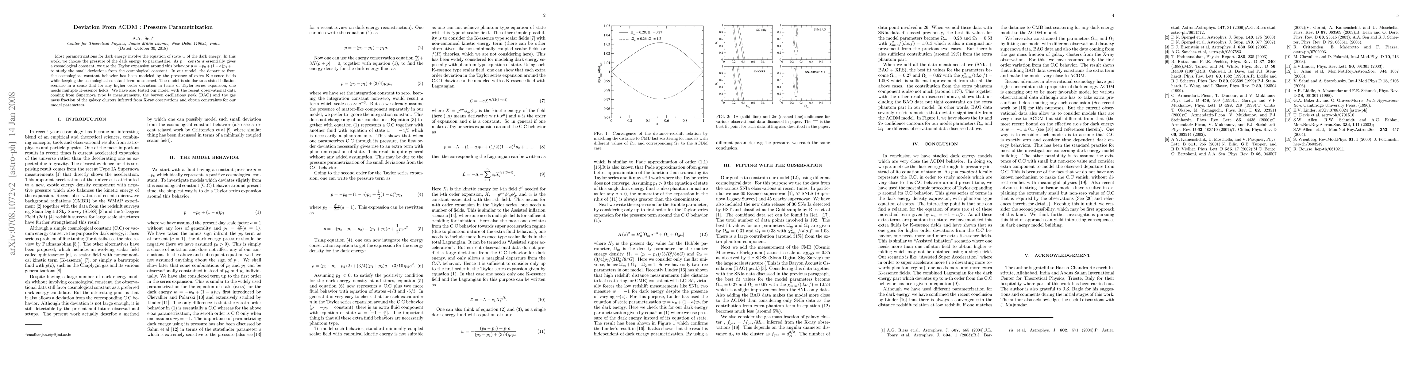 This research paper explores an alternative approach to dark energy parametrization by focusing on pressure deviations instead of equation of state w. It uses a Taylor expansion model with extra K-essence fields to study small departures from the cosmological constant.