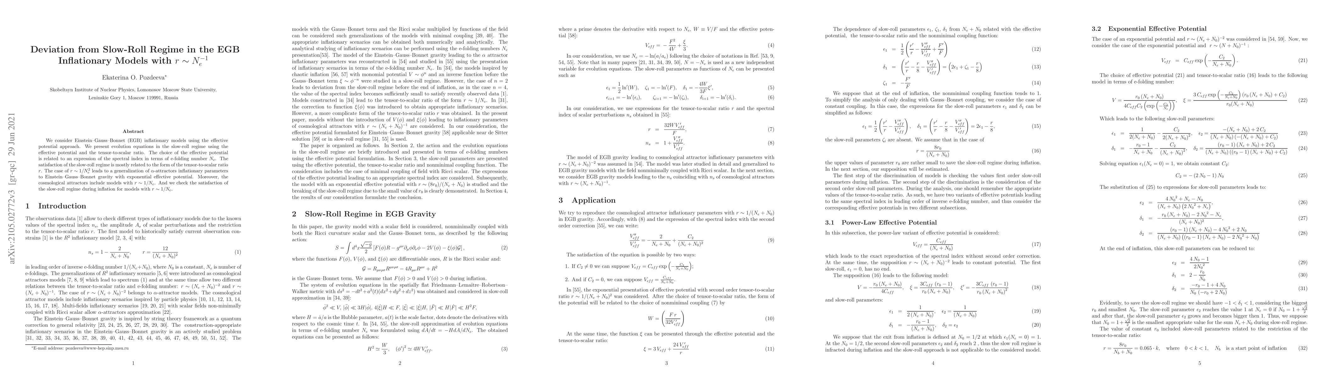 The paper presents a detailed analysis of slow-roll parameters and tensor-to-scalar ratio in EGB inflationary models using effective potential approach, identifying cosmological attractors for r∗ ~ N_e^(-1).